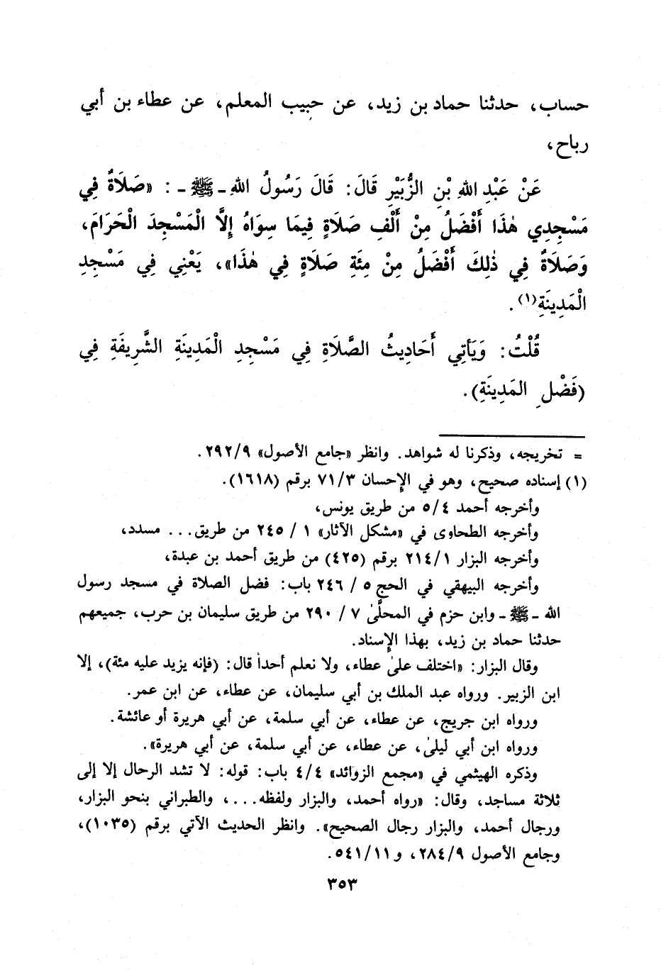 عَنْ عَبْدِ اللهِ بْنِ الزُّبَيْرِ قَالَ: قَالَ رَسُولُ اللهِ - صلى الله عليه وسلم-: "صلاَةٌ فِي مَسْجِدِي هذَا أفْضَلُ مِنْ ألْفِ صَلاَةٍ فِيمَا سِوَاهُ إلاَّ الْمَسْجِدَ الْحَرَامَ، وَصلاَةٌ فِي ذلِكَ أفْضَلُ مِنْ مِئَةِ صلاَةٍ فِي هذَا"، يَعْنِي فِي مَسْجِدِ الْمَدِينَةِ (¬1).