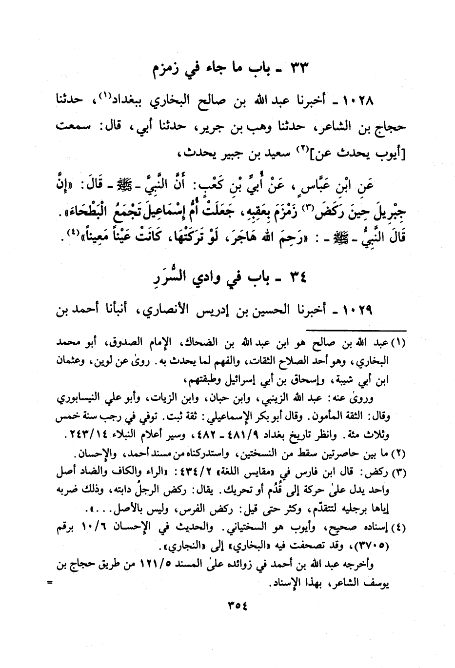 1028 - أخبرنا عبد الله بن صالح البخاري ببغداد (¬1)، حدثنا حجاج بن الشاعر، حدثنا وهب بن جرير، حدثنا أبي، قال: سمعت [أيوب يحدث عن] (¬2) سعيد بن جبير يحدث، عَنِ ابْنِ عَبَّاس، عَنْ أُبيِّ بْنِ كَعْبٍ: أَنَّ النَّبِيَّ -صلى الله عليه وسلم- قَالَ: "إِنَّ جِبْرِيلَ حِينَ رَكَضَ (¬3) زَمْزَمَ بعَقِبِهِ، جَعَلَت أمُّ إسْمَاعِيلَ تَجْمَعُ الْبَطْحَاءَ". قَالَ النَّبِيُّ -صلى الله عليه وسلم-: " رَحِمَ الله هَاجَرَ، لَوْ تَرَكَتْهَا، كَانَتْ عَيْناً مَعِيناً" (¬4).