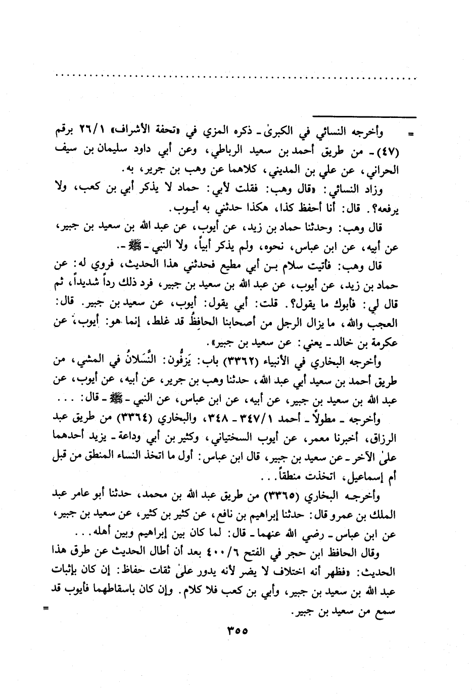 وقال الحافظ ابن حجر في الفتح 6/ 400 بعد أن أطال الحديث عن طرق هذا الحديث: "فظهر أنه اختلاف لا يضر لأنه يدور على ثقات حفاظ: إن كان بإثبات عبد الله بن سعيد بن جبير، وأبي بن كعب فلا كلام. وان كان باسقاطهما فأيوب قد سمع من سعيد بن جبير. =