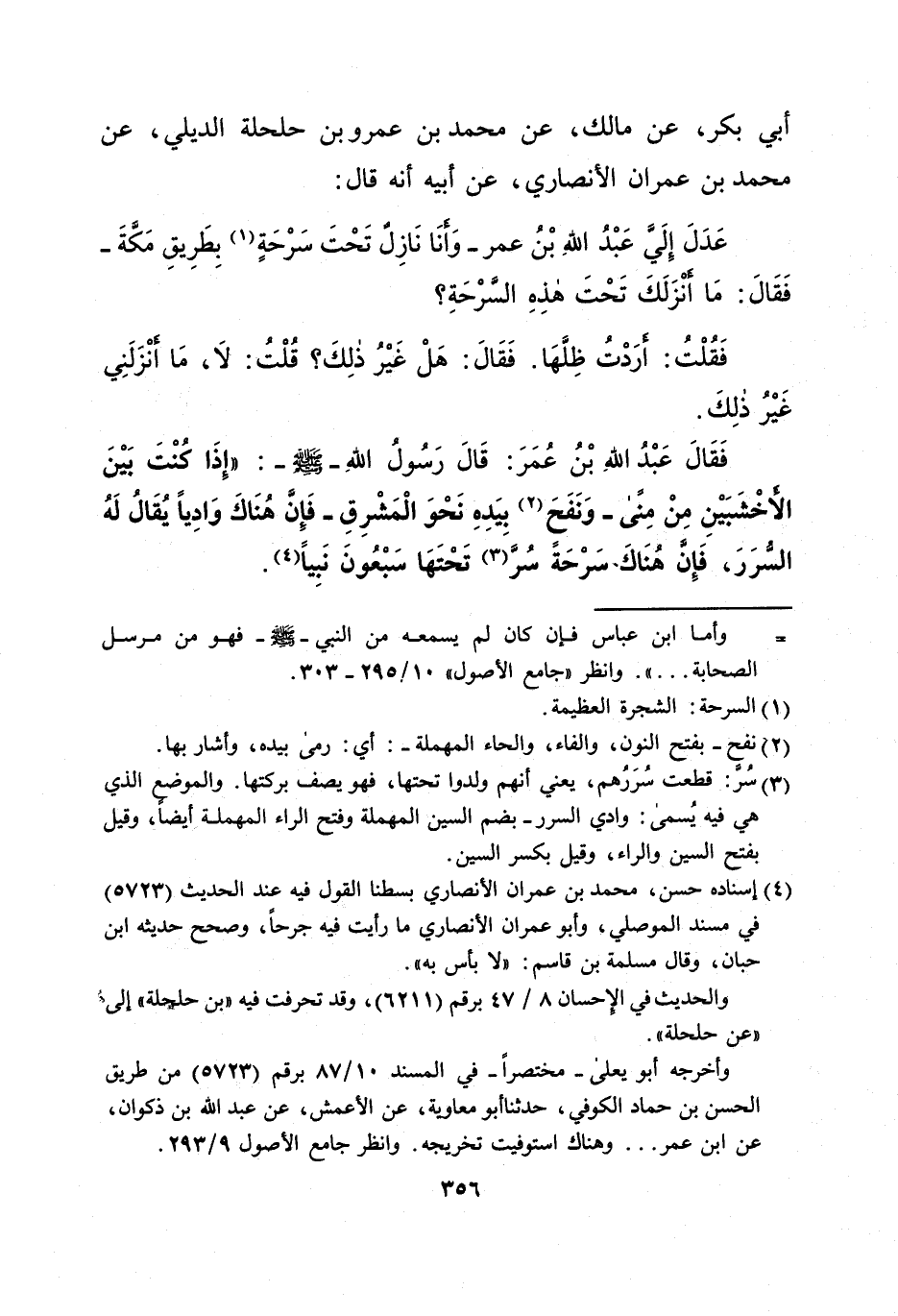 عَدَلَ إِليَّ عَبْدُ الله بْنُ عمر- وَأنَا نَازِلٌ تَحْتَ سَرْحَةٍ (¬1) بِطَرِيقِ مَكَّةَ- فَقَالَ: مَا أنْزَلَكَ تَحْتَ هذِهِ السَّرْحَةِ؟ فَقُلْتُ: أرَدْتُ ظِلَّهَا. فَقَالَ: هَلْ غَيْرُ ذلِكَ؟ قُلْتُ: لا، مَا أَنْزَلَنِي غَيْرُ ذلِكَ. فَقَالَ عَبْدُ اللهِ بْنُ عُمَرَ: قَالَ رَسُولُ الله -صلى الله عليه وسلم-: "إذَا كُنْتَ بَيْنَ الأَخْشَبَيْنِ مِنْ مِنًى- وَنَفَحَ (¬2) بِيَدِهِ نَحْوَ الْمَشْرِقِ- فَإِنَّ هُنَاكَ وَادِياً يُقَالُ لَهُ السُّرَرَ، فَإِنَّ هُنَاكَ سَرْحَةً سُرَّ (¬3) تَحْتَهَا سَبْعُونَ نَبِياً (¬4).