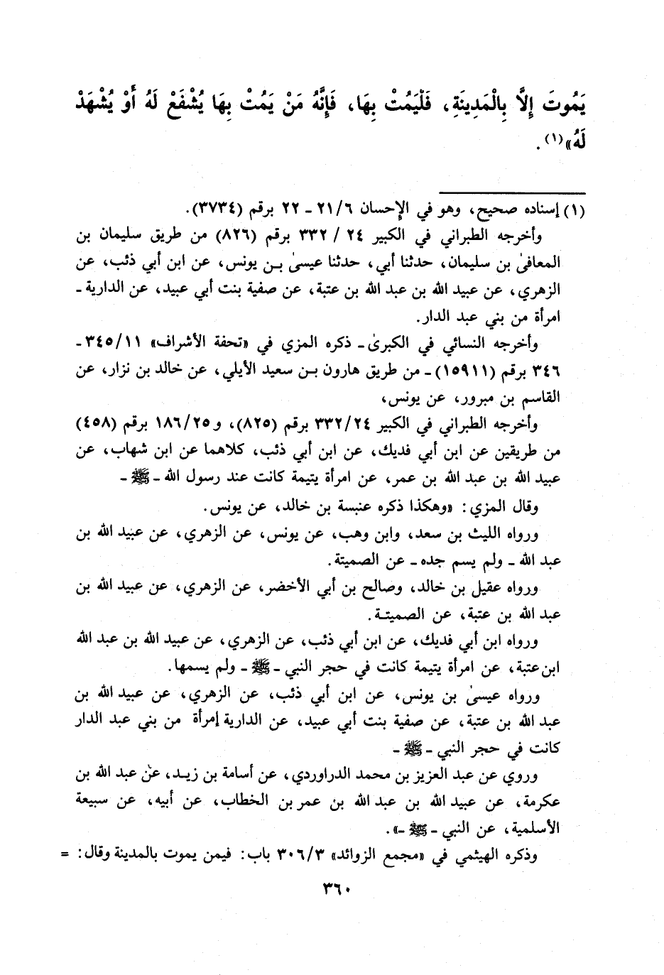 يَمُوتَ إلاَّ بِالْمَدِينَةِ، فَلْيَمُتْ بِهَا، فَإنَّهُ مَنْ يَمُتْ بِهَا يُشْفَعْ لَه أوْ يُشْهَدْ لَه" (¬1).