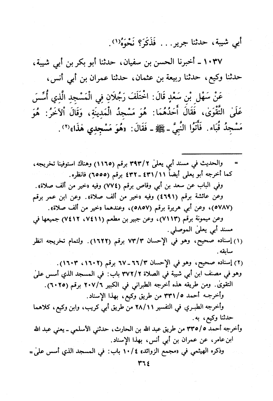 عَنْ سَهْلِ بْنِ سَعْدٍ قَالَ: اخْتَلَفَ رَجُلانِ فِي الْمَسْجِدِ الَّذِي أُسِّسَ عَلَى التَّقْوَى، فَقَالَ أحَدُهُمَا: هُوَ مَسْجِدُ الْمَدِينَةِ، وَقَالَ اْلآخَرُ: هُوَ مَسْجِدُ قُبَاء. فَأتَوُا النَّبِيَّ -صلى الله عليه وسلم- فَقَالَ: "هُوَ مَسْجِدِي هذَا" (¬2).