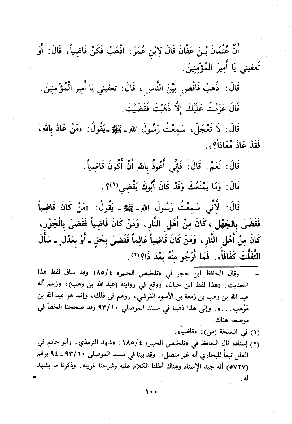 أنَّ عُثْمَانَ بْنَ عَفَّانَ قَالَ لاِبْنِ عُمَرَ: اذْهَبْ فَكُنْ قَاضِياً، قَالَ: أوَ تَعفيني يَا أمِيرَ المُؤْمِنِينَ. قَالَ: اذْهَبْ فَاقْضِ بَيْنَ النَّاسِ، قَالَ: تعفيني يَا أمِيرَ الْمُؤْمِنِينَ. قَالَ عَزَمْتُ عَلَيْكَ إِلاَّ ذَهَبْتَ فَقَضَيْتَ. قَالَ: لا تَعْجَلْ، سَمِعْتُ رَسُولَ اللهِ - صلى الله عليه وسلم - يَقُولُ: "مَنْ عَاذَ بِالله، فَقَدْ عَاذَ مُعَاذاً؟ ". قَالَ: نَعَمْ. قَالَ: فَإِنِّي أعُوذُ بِاللهِ أنْ أكُونَ قَاضِياً. قَالَ: وَمَا يَمْنَعُكَ وَقَدْ كَانَ أبُوكَ يَقْضِي (¬1)؟. قَالَ: لأنَي سَمِعْتُ رَسُولَ اللهِ - صلى الله عليه وسلم - يَقُولُ: "مَنْ كَانَ قَاضِياً فَقَضَى بِالجَهْل، كَانَ مِنْ أهْلِ النَّارِ، وَمَنْ كَانَ قَاضِياً فَقَضَى بِالْجَوْر، كَانَ مِنْ أهْلِ الَنَّارِ، وَمَنْ كَانَ قَاضِياً عَالِماً فَقَضَى بِحَقٍ - أوْ بِعَدْلٍ- سَأَلَ التَّفَلُّتَ كَفَافَاً". فَمَا أرْجُو مِنْهُ بَعْدَ ذَا؟ (¬2).
