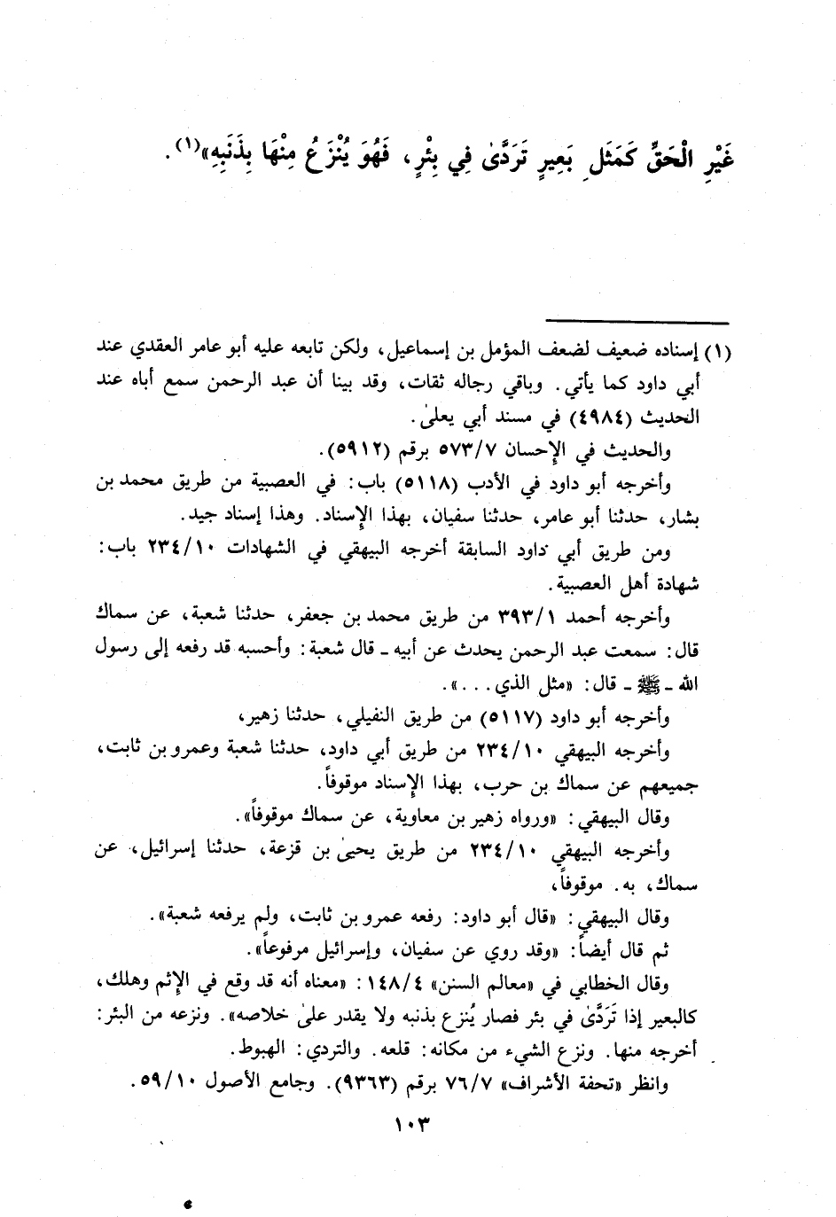 غيرالْحَقِّ كَمَثَلِ بَعِيرٍ تَرَدَّى فِي بِئْرٍ، فَهُوَ يُنْزَعُ مِنْهَا بِذَنَبِهِ" (¬1).