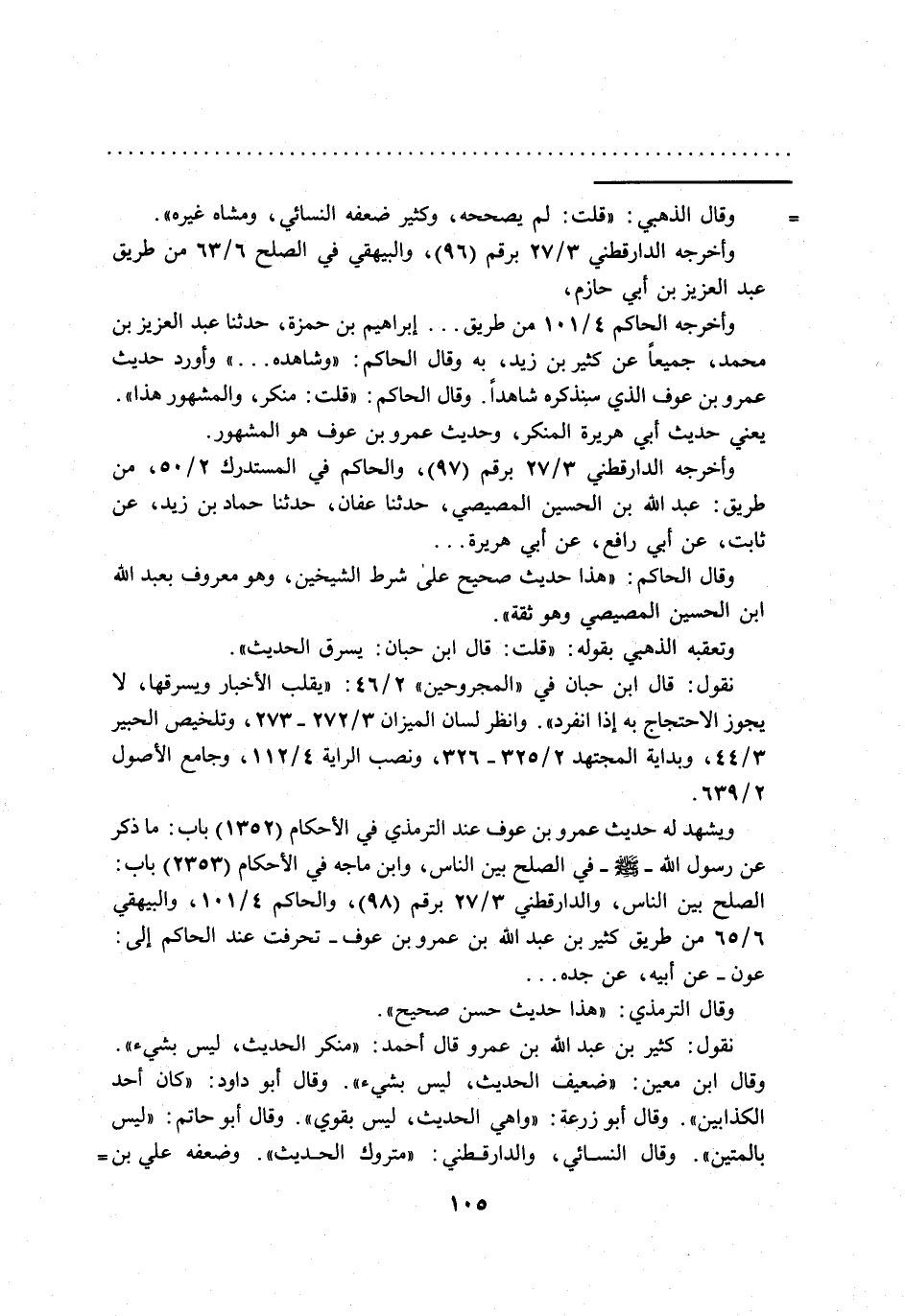 = وقال الذهبي: "قلت: لم يصححه، وكثير ضعفه النسائي، ومشاه غيره". وأخرجه الدارقطني 3/ 27 برقم (96)، والبيهقي في الصلح 6/ 63 من طريق عبد العزيز بن أبي حازم،