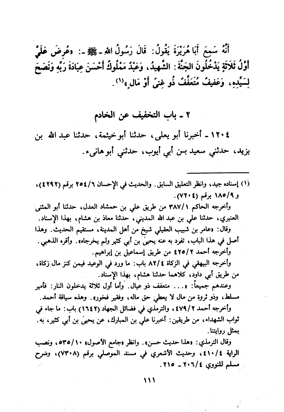 أَنهُ سمع أَبَا هُرَيْرَةَ يَقُولُ: قَالَ رَسُولُ الله - صلى الله عليه وسلم -:"عُرِضَ عليَّ أَوَّلُ ثَلاَثَةٍ يَدْخُلُونَ الجَنَّةَ: الشَّهيدُ، وَعَبْدٌ مَمْلُوكٌ أَحْسَنَ عِبَادَةَ رَبِّهِ وَنصَحَ لِسَيِّدِهِ، وعفيفٌ مُتَعفِّفٌ ذُو غِنىً أَوْ مال" (¬1).