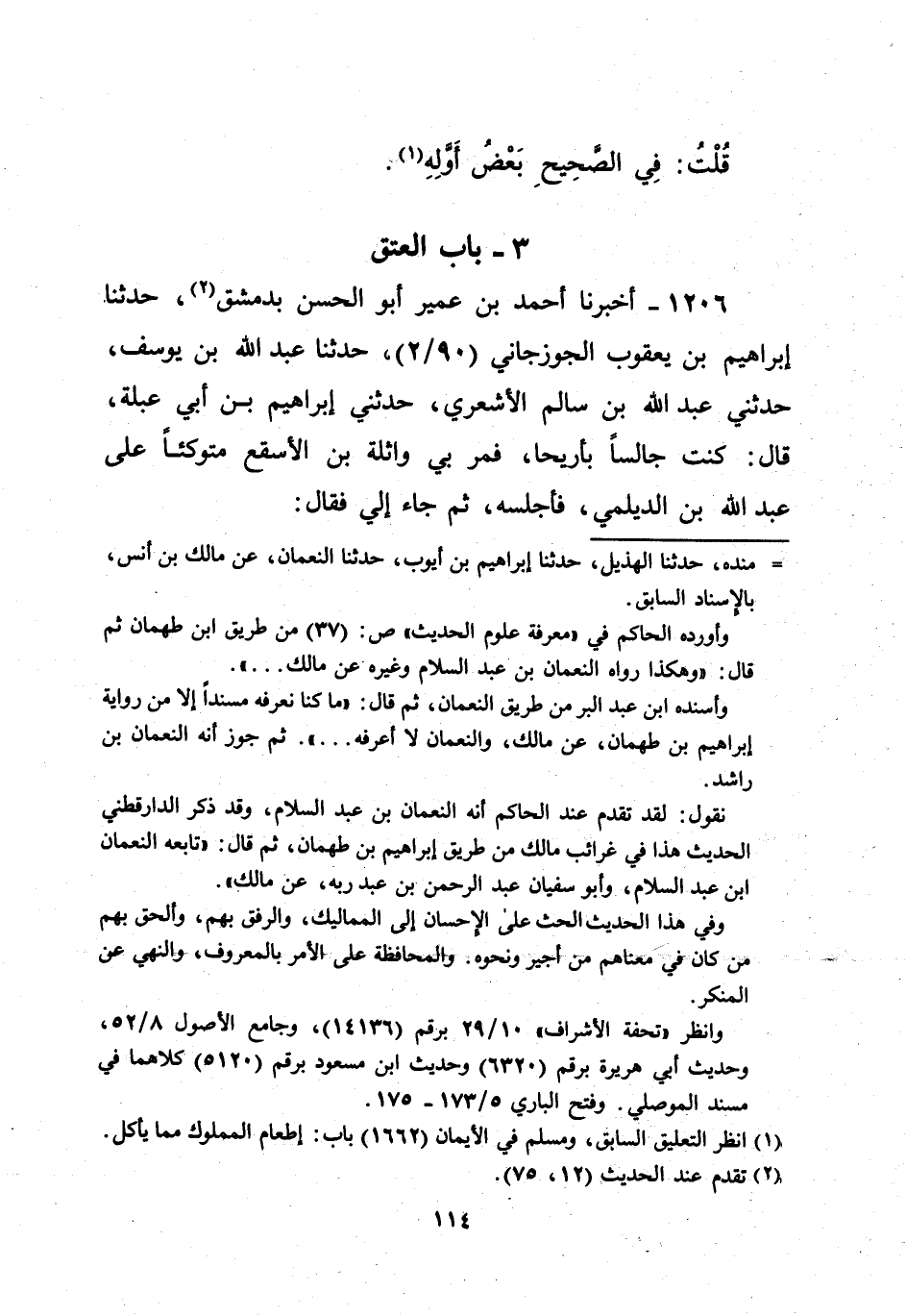 1206 - أخبرنا أحمد بن عمير أبو الحسن بدمشق (¬2)، حدثنا، إبراهيم بن يعقوب الجوزجاني (90/ 2)، حدثنا عبد الله بن يوسف، حدثني عبد الله بن سالم الأشعري، حدثني إبراهيم بن أبي عبلة، قال: كنت جالساً بأريحا، فمر بي واثلة بن الأسقع متوكئاً على عبد الله بن الديلمي، فأجلسه، ثم جاء الي فقال: