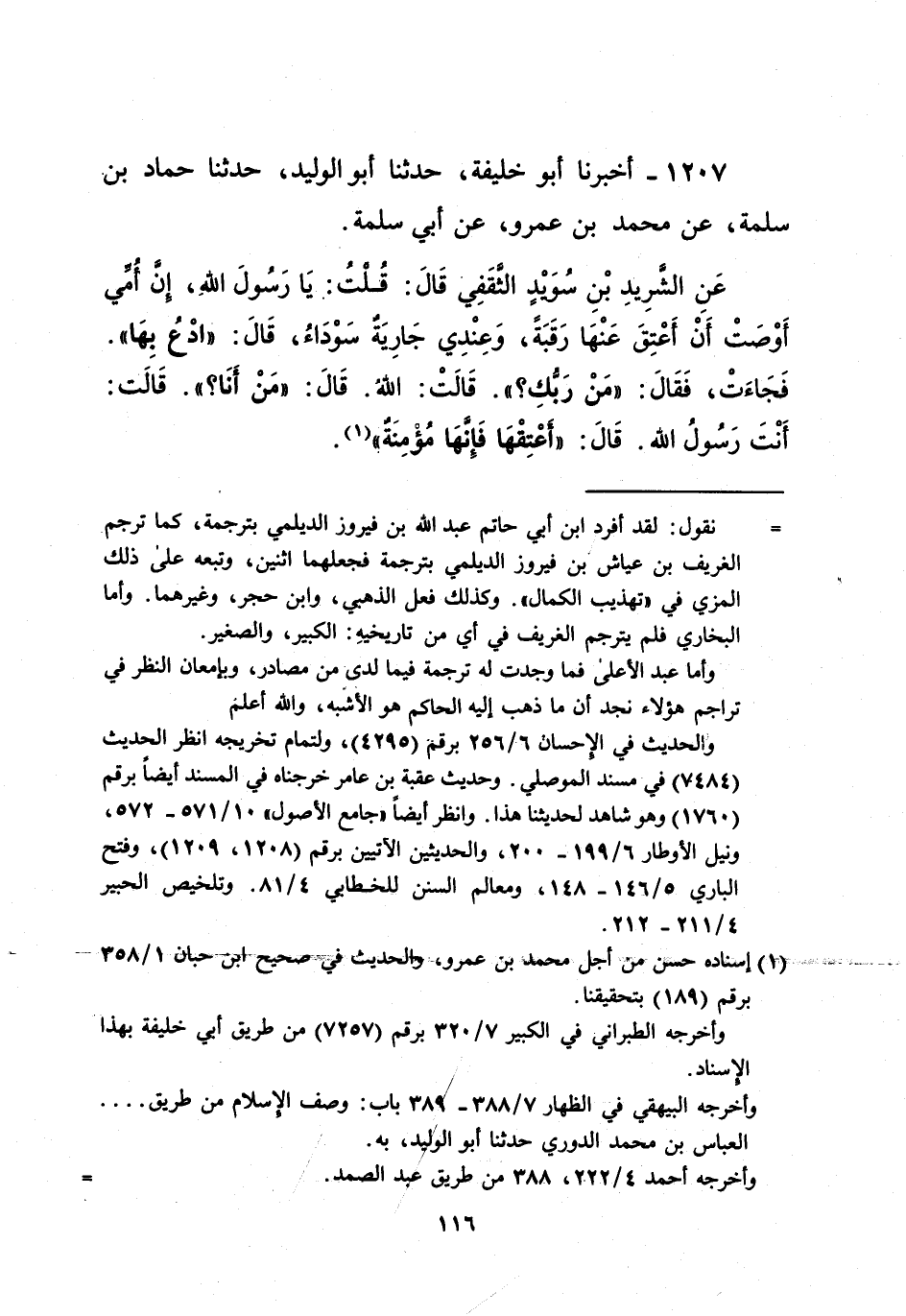 عَنِ الشَّرِيدِ بْنِ سُويدٍ الثَّقَفِي قَالَ: قُلْتُ: يَا رسول الله، إن أُمِّى أَوْصَتْ أَنْ أَعْتِقَ عَنْهَا رَقَبَةً، وَعِنْدِي جَارِيَة سَوْدَاءُ، قَالَ: "ادْعُ بِهَا". فَجَاءَتْ، فَقَالَ: "مَنْ رَبُّكِ؟ ". قَالَتْ: اللهُ. قَالَ: "مَنْ أنَا؟ ". قَالَت: أَنْتَ رَسُولُ الله. قَالَ:" أعْتِقْهَا فَإِنَّهَا مُؤْمِنَةٌ" (¬1).