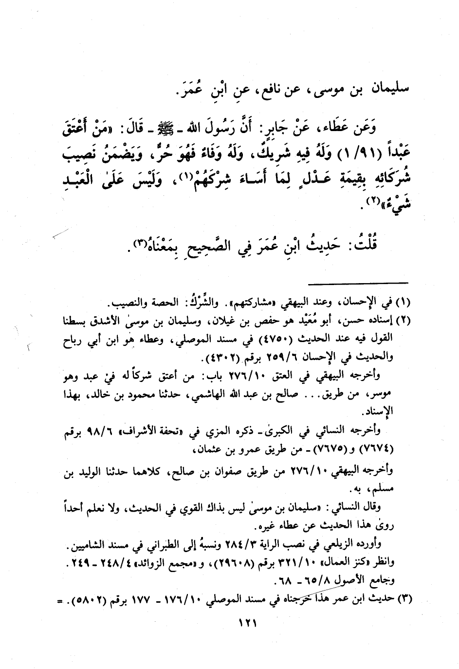 وَعَن عَطَاء، عَنْ جَابِرٍ: أَنَ رسول الله - صلى الله عليه وسلم - قَالَ: "مَنْ أَعْتَقَ عَبْداً (91/ 1) وَلَهُ فِيهِ شَرِيك، وَلَهُ وَفَاءٌ فَهُوَ حُرٌّ، وَيَضْمَنُ نَصِيبَ شُرَكَائِهِ بِقِيمَةِ عَدْل لِمَا أسَاءَ شِرْكَهمْ (¬1)، وَلَيْسَ عَلَى الْعَبْدِ شىءٌ" (¬2).