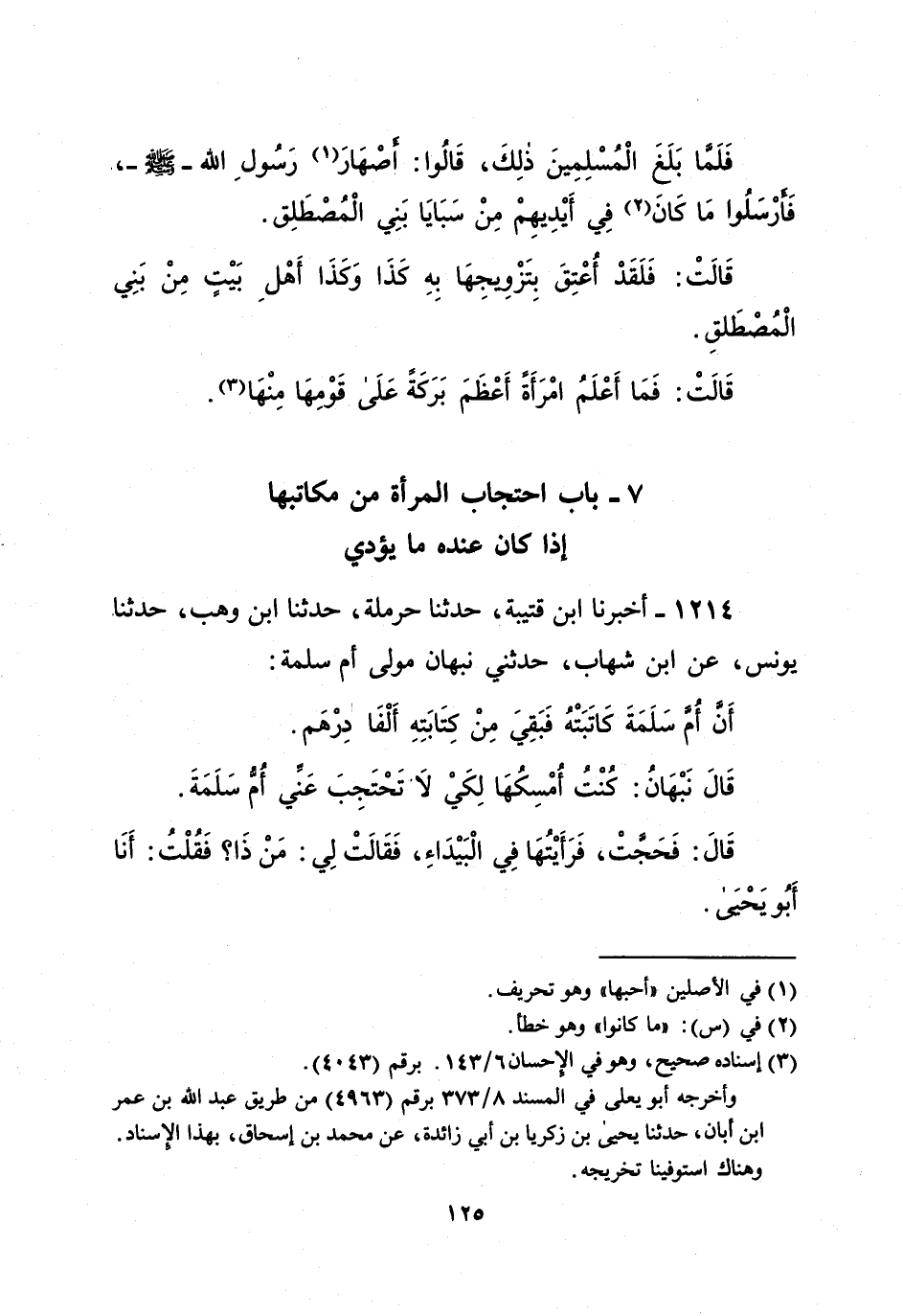 1214 - أخبرنا ابن قتيبة، حدثنا حرملة، حدثنا ابن وهب، حدثنا يونس، عن ابن شهاب، حدثني نبهان مولى أم سلمة: