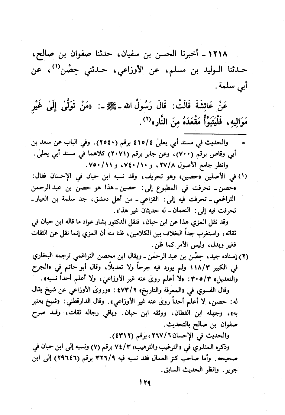 1218 - أخبرنا الحسن بن سفيان، حدثنا صفوان بن صالح، حدثنا الوليد بن مسلم، عن الأوزاعي، حدثني حِصْن (¬1)، عن أبي سلمة.