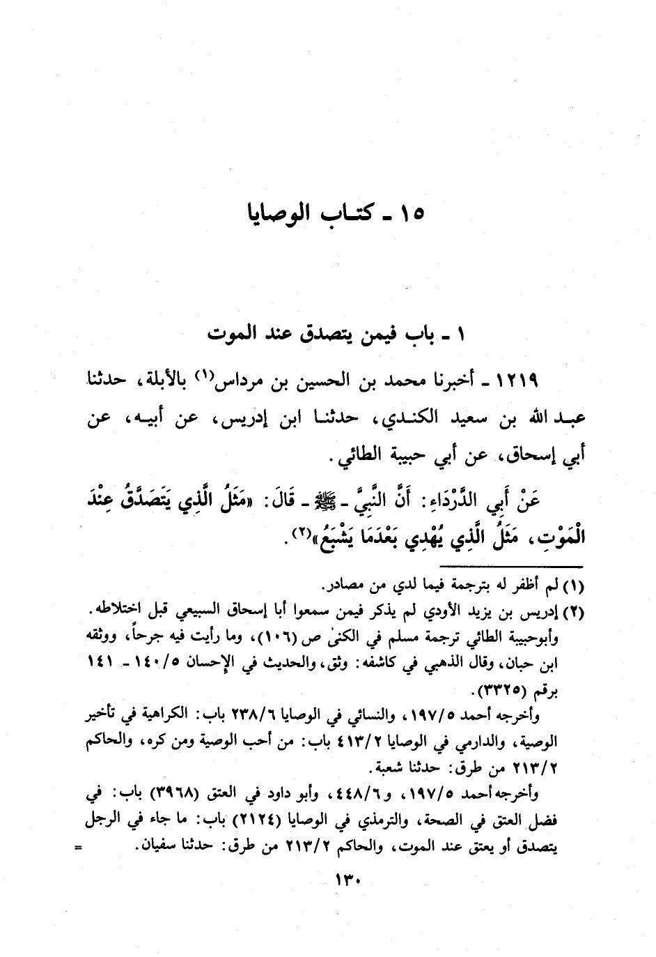 عَنْ أَبِي الدَّرْدَاءِ: أَنَّ النَّبِيّ - صلى الله عليه وسلم - قَالَ: "مَثَلُ الَّذِي يَتَصَدَّقُ عِنْدَ الْمَوْتِ، مَثَلُ الَّذِي يُهْدِي بَعْدَمَا يَشْبَعُ" (¬2).