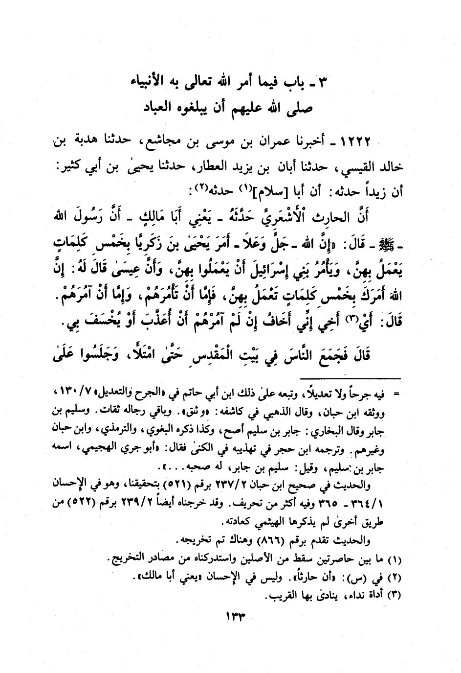 أَنَّ الحارِث اْلأَشْعَريَّ حدَّثَهُ- يَعْنِي أَبَا مَالِكٍ - أَنَّ رسولَ الله - صلى الله عليه وسلم - قَالَ: "إِنَّ الله -جَلَّ وَعَلاَ- أَمَرَ يَحْيَى بنَ زَكَريا بِخَمْسِ كلمَاتٍ يَعْمَلُ بِهِنَّ، وَيَأْمُرُ بَنِي إِسْرَائِيلَ أنْ يَعْمَلُوا بِهِن، وَأَنَّ عِيسَى قَالَ لَهُ: إِنَّ اللهَ أمَرَكَ بِخَمْسِ كَلِمَاتٍ تَعْمَلُ بِهِنَّ، فَإِمَّا أَنْ تَأمُرَهُمْ، وَإِما أَنْ آمُرَهُمْ. قَالَ: أَيْ (¬3) أَخِي إِنِّي أخَافُ إِنْ لَمْ آمُرْهُمْ أنْ أعَذَّبَ أَوْ يُخْسَفَ بى. قَالَ فَجَمَعَ النَّاسَ فِي بَيْتِ الْمَقْدِسِ حَتى امْتَلأ، وَجَلَسُوا عَلَى