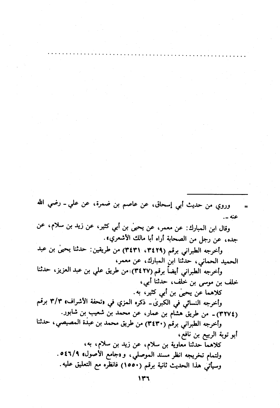 وقال ابن المبارك: عن معمر، عن يحيى بن أبي كثير، عن زيد بن سلام، عن جده، عن رجل من الصحابة أراه أبا مالك الأشعري".