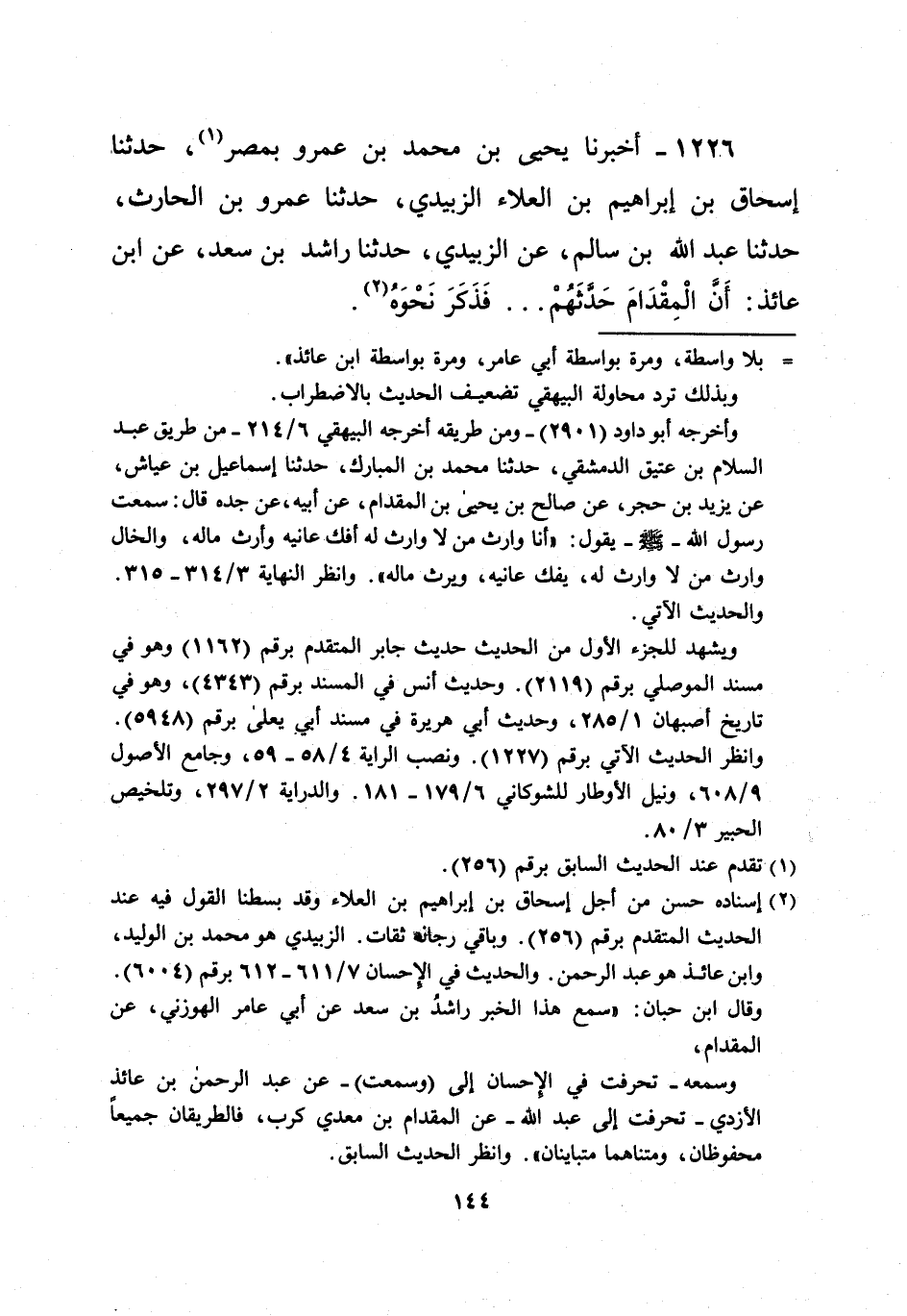 وقال ابن حبان: "سمع هذا الخبر راشدُ بن سعد عن أبي عامر الهوزني، عن المقدام، وسمعه- تحرفت في الإحسان إلى (وسمعت) - عن عبد الرحمن بن عائذ الأزدي- تحرفت إلى عبد الله- عن المقدام بن معدي كرب، فالطريقان جميعاً محفوظان، ومتناهما متباينان". وانظر الحديث السابق.