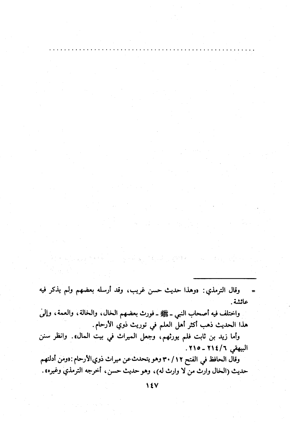 وقال الحافظ في الفتح 12/ 30 وهو يتحدث عن ميراث ذوي الأرحام: "ومن أدلتهم حديث (الخال وارث من لا وارث له)، وهو حديث حسن، أخرجه الترمذي وغيره".