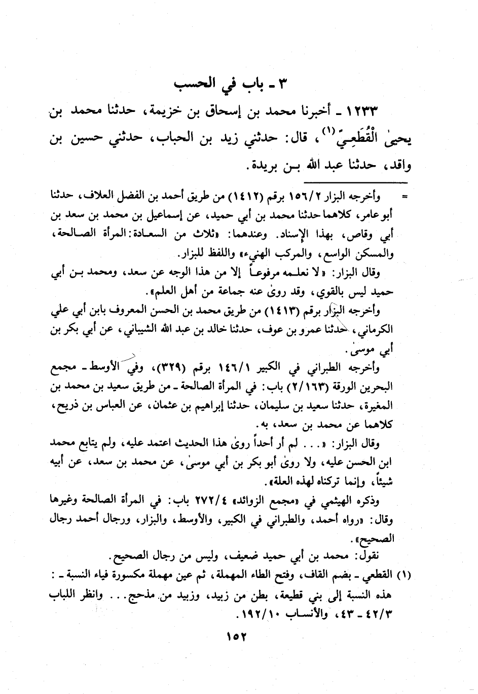 1233 - أخبرنا محمد بن إسحاق بن خزيمة، حدثنا محمد بن، يحيى الْقُطَعِيّ (¬1)، قال: حدثني زيد بن الحباب، حدثني حسين بن واقد، حدثنا عبد الله بن بريدة.
