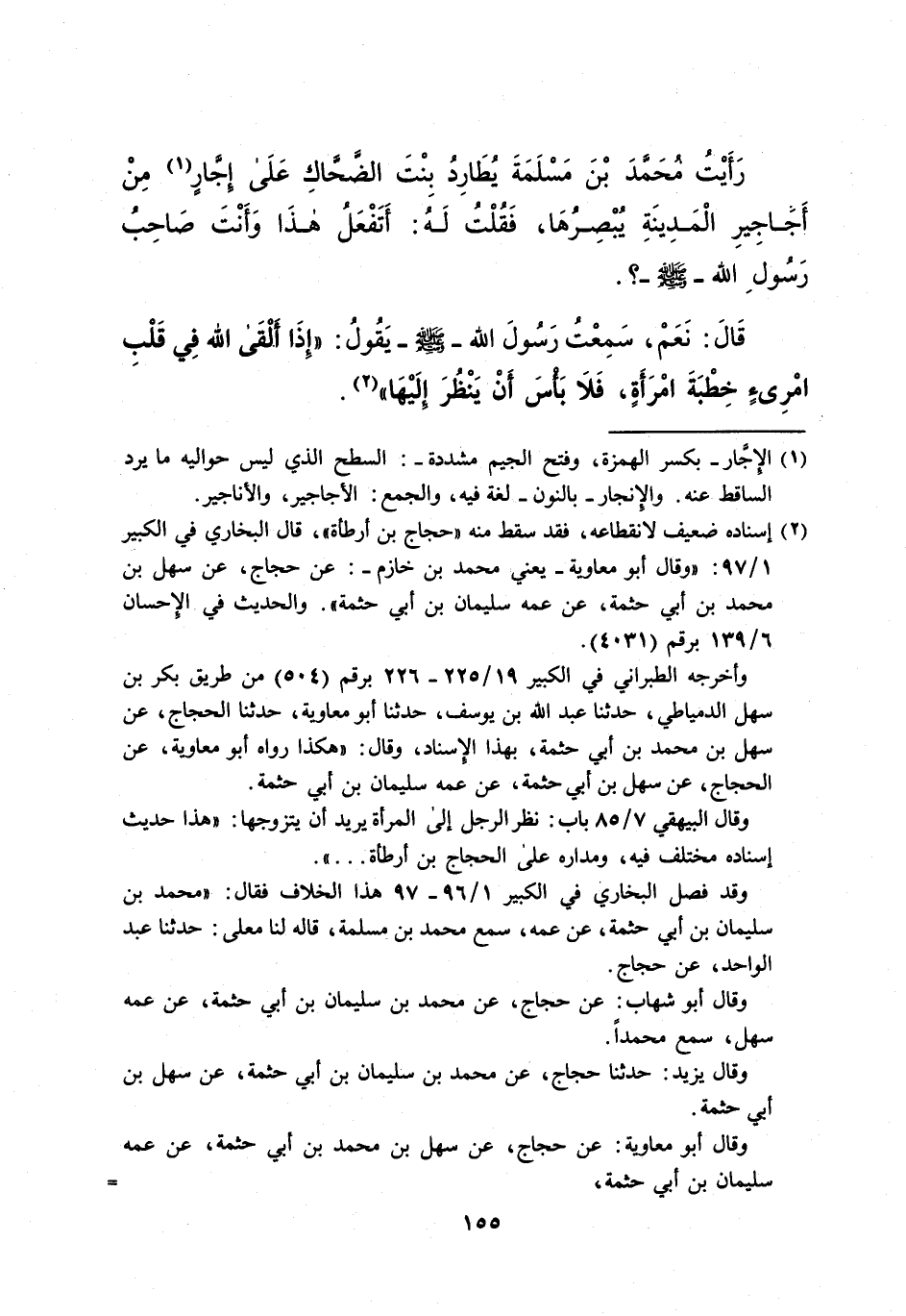 رَأَيْتُ مُحَمَّدَ بْنَ مَسْلَمَةَ يُطَارِدُ بِنْتَ الضَّحَّاكِ عَلَى إجَّارٍ (¬1) مِنْ أَجاجِيرِ الْمَدِينَةِ يُبْصِرُهَا، فَقُلْتُ لَهُ: أَتَفْعَلُ هذَا وَأَنْتَ صَاحِبُ رَسُولِ الله - صلى الله عليه وسلم -؟. قَالَ: نَعَمْ، سَمِعْتُ رَسُولَ الله - صلى الله عليه وسلم - يَقُولُ: "إِذَا ألْقَى الله فِي قَلْبِ امْرِىءٍ خِطْبَةَ امْرَأَةٍ، فَلا بَأْسَ أَنْ يَنْظُرَ إلَيْهَا" (¬2).