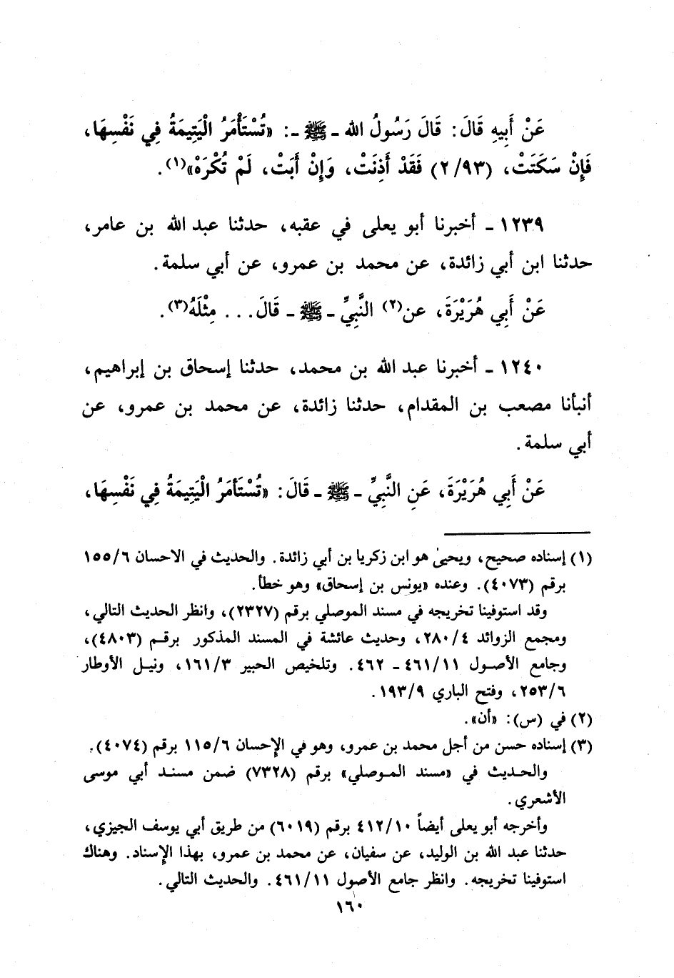 عَنْ أَبِي هُرَيْرَةَ، عَنِ النَّبِيِّ - صلى الله عليه وسلم - قَالَ: "تُسْتَأمَرُ الْيَتِيمَةُ فِي نَفْسِهَا،