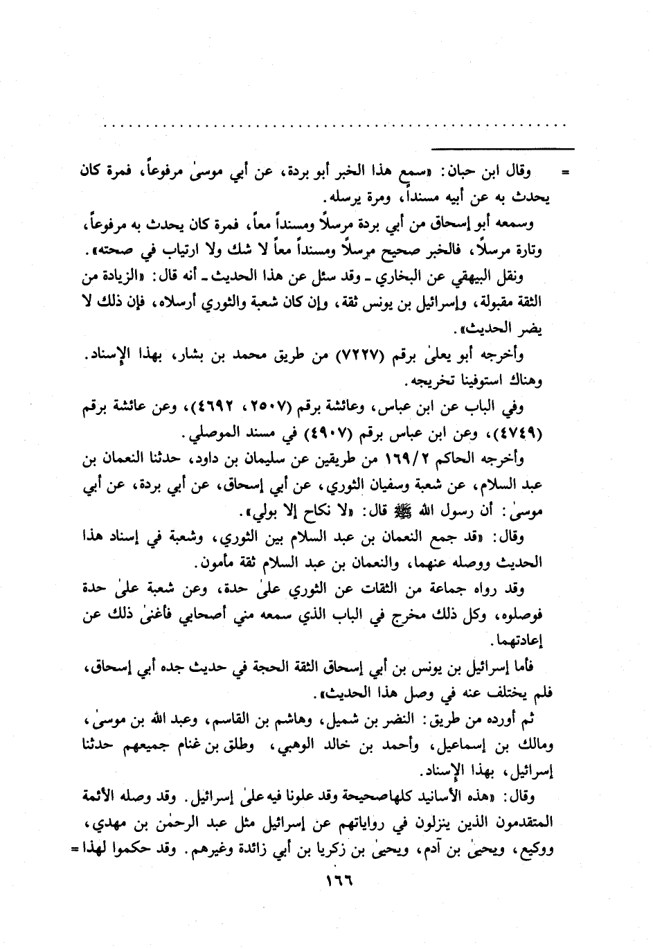 وأخرجه الحاكم 2/ 169 من طريقين عن سليمان بن داود، حدثنا النعمان بن عبد السلام، عن شعبة وصفيان الثوري، عن أبي إسحاق، عن أبي بردة، عن أبي موسى: أن رسول الله - صلى الله عليه وسلم - قال:" لانكاح إلابولي".