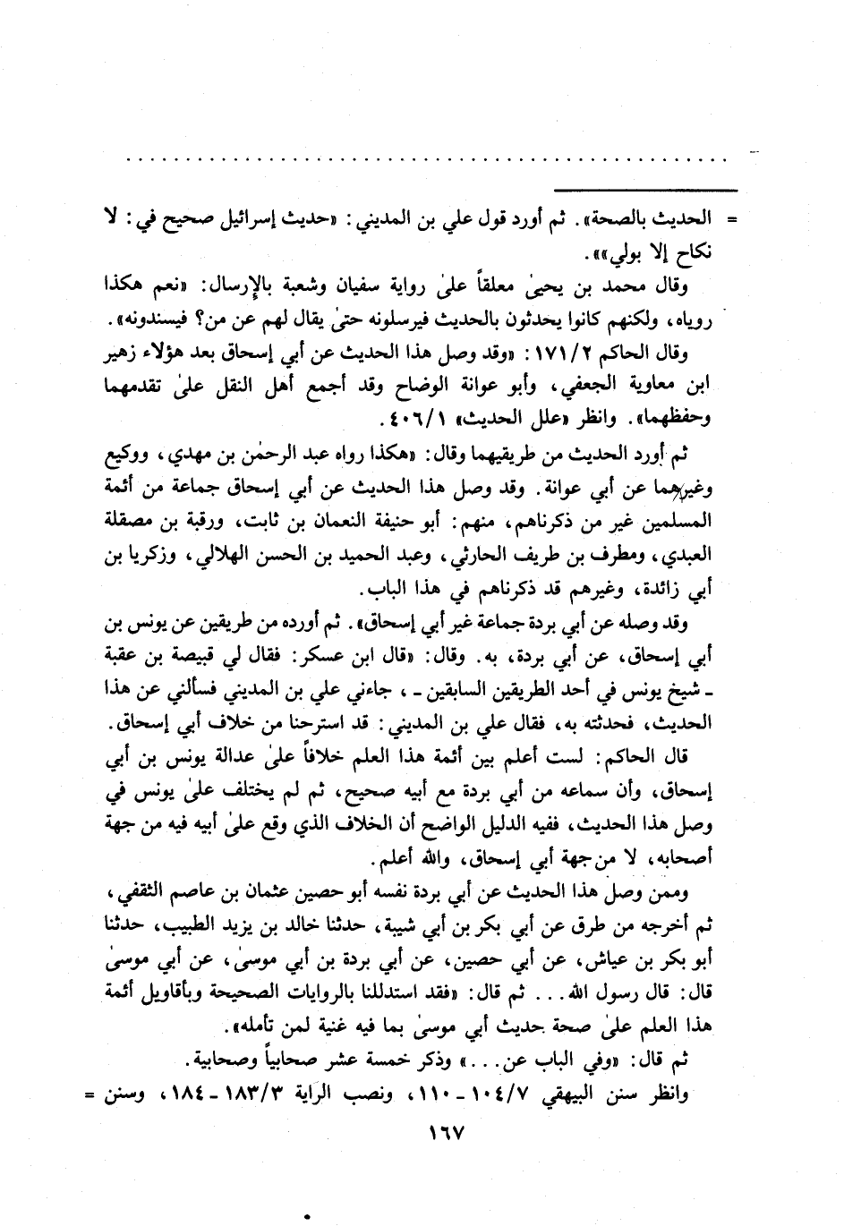 = الحديث بالصحة". ثم أورد قول علي بن المديني: "حديث إسرائيل صحيح في: لا نكاح إلا بولي".