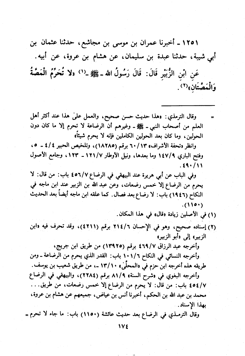 1251 - أخبرنا عمران بن موسى بن مجاشع، حدثنا عثمان بن أبي شيبة، حدثنا عبدة بن سليمان، عن هشام بن عروة، عن أبيه.