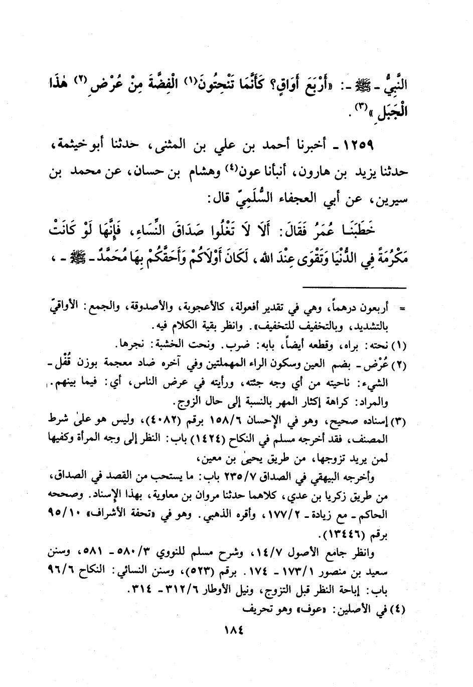 (¬2) عُرْض- بضم العين وسكون الراء المهملتين وفي آخره ضاد معجمة بوزن قُفْل- الشيء: ناحيته من أي وجه جئته، ورأيته في عرض الناس، أي: فيما بينهم. والمراد: كراهة إكثار المهر بالنسبة إلى حال الزوج.