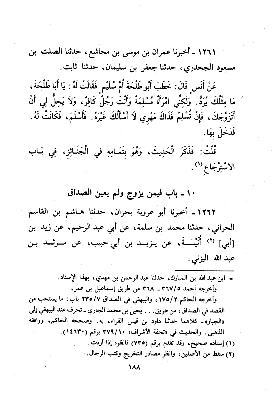 عَنْ أَنَسٍ قَالَ: خَطَبَ أَبُوطَلْحَةَ أُمَّ سُلَيْمٍ فَقَالَتْ لَهُ: يَا أَبَا طَلْحَةَ، مَا مِثْلُكَ يُرَدُّ. وَلكِنِّي امْرَأَةٌ مُسْلِمَةٌ وَأَنْتَ رَجُلٌ كَافِرٌ، وَلا يَحِلُّ لِي أَنْ أَتَزَوَّجَكَ، فَإنْ تُسْلِمْ فَذَاكَ مَهْرِي لا أَسْاَلُكَ غَيْرَهُ. فَأسْلَمَ، فَكَانَتْ لَهُ. فَدَخَلَ بِهَا. ْقُلْتُ: فَذَكَرَ الْحَدِيثَ، وَهُوَ بِتَمَامِهِ في الْجَنَائِزِ، فِي بَاب الاسْتِرْجَاعِ (¬1).