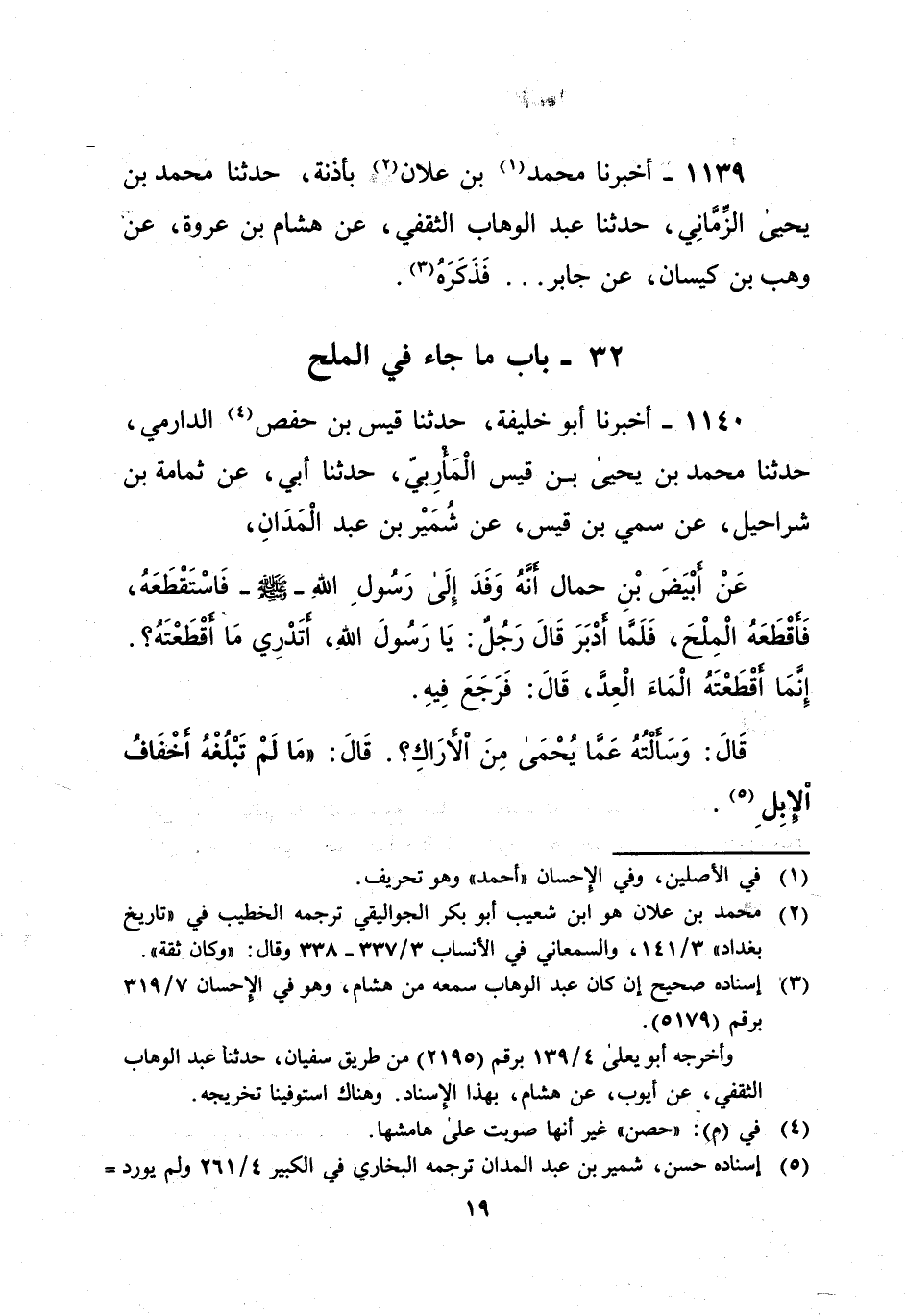 1140 - أخبرنا أبو خليفة، حدثنا قيس بن حفص (¬4) الدارمي، حدثنا محمد بن يحيى بن قيس الْمَأْرِبيّ، حدثنا أبي، عن ثمامة بن شراحيل، عن سمي بن قيس، عن شُمَيْر بن عبد الْمَدَانِ، عَنْ أبْيَضَ بْنِ حمال أنَّهُ وَفَدَ إِلَى رَسُولِ الله - صلى الله عليه وسلم - فَاسْتَقْطَعَهُ، فَأقْطَعَهُ الْمِلْحَ، فَلَمَّا أدْبَرَ قَالَ رَجُل: يَا رسول الله، أتَدْرِي مَا أقْطَعْتَهُ؟. إِنَمَا أقْطَعْتَهُ الْمَاءَ الْعِدَّ، قَالَ: فَرَجَعَ فِيهِ. قَالَ: وَسَألْتُهُ عَمَّا يُحْمَى مِنَ اْلأرَاكِ؟. قَالَ: "مَا لَمْ تَبْلُغْهُ أخْفَافُ اْلإبِلَ (¬5).