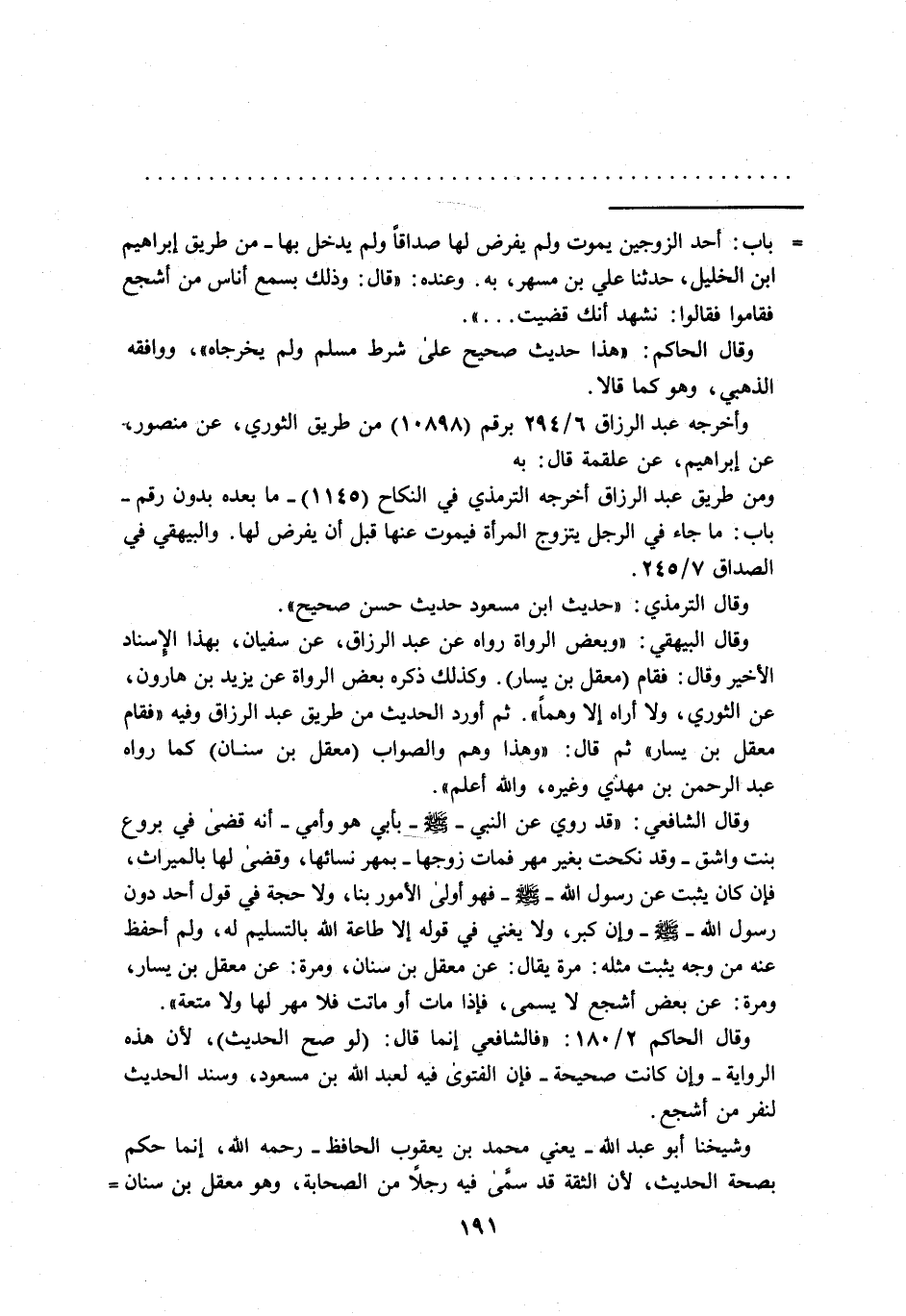 = باب: أحد الزوجين يموت ولم يفرض لها صداقاً ولم يدخل بها- من طريق إبراهيم ابن الخليل، حدثنا علي بن مسهر، به. وعنده: "قال: وذلك بسمع أناس من أشجع فقاموا فقالوا: نشهد أنك قضيت ... ".
