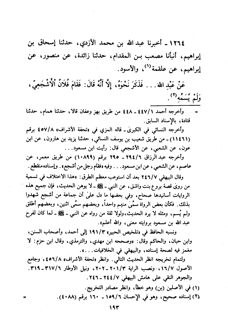 1264 - أخبرنا عبد الله بن محمد الأزدي، حدثنا إسحاق بن إبراهيم، أنبأنا مصعب بن المقدام، حدثنا زائدة، عن منصور، عن إبراهيم، عن علقمة (¬1)، والأسود.