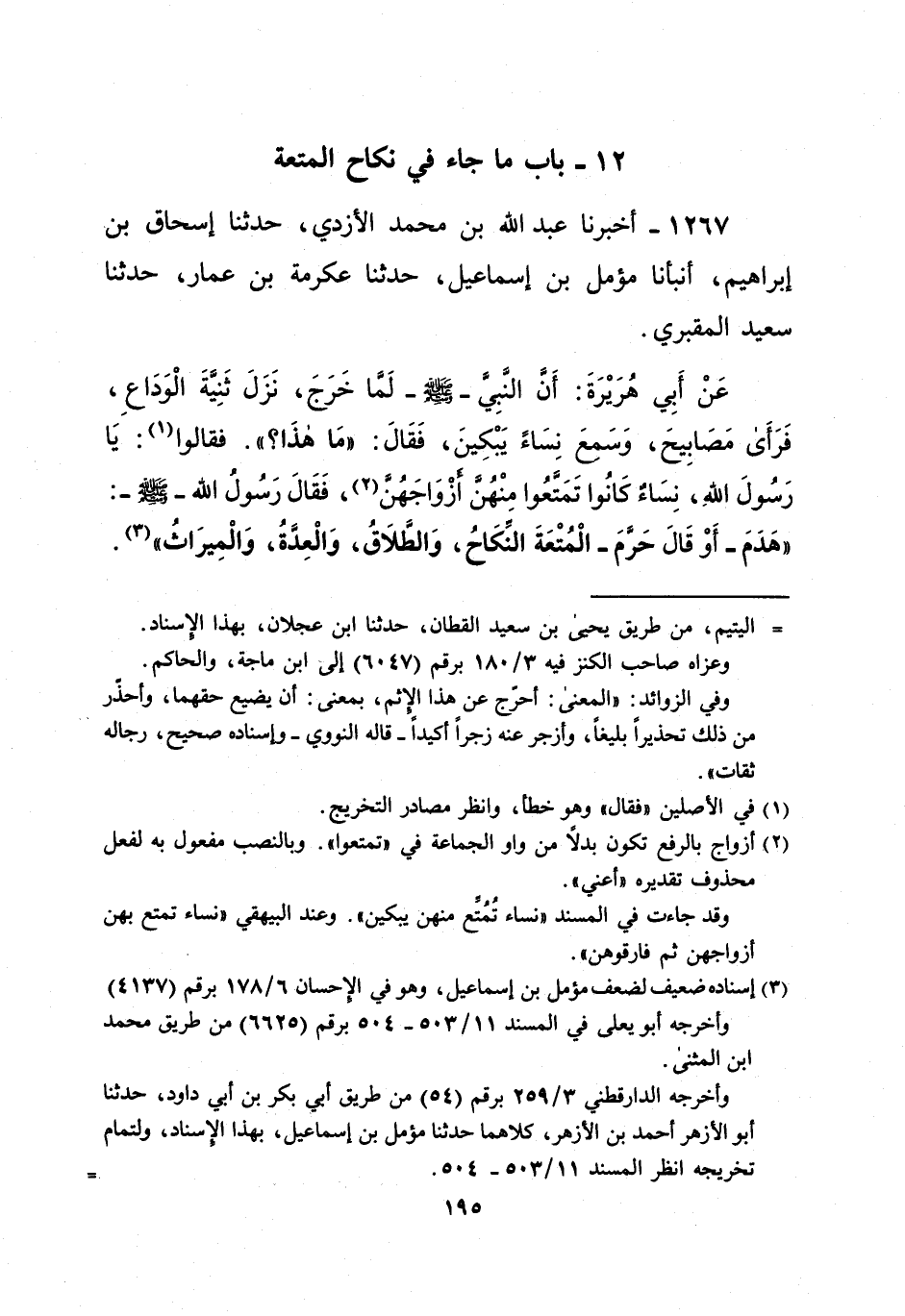 عَنْ أَبِي هُرَيْرَةَ: أَنَ النَّبِيّ - صلى الله عليه وسلم - لَما خَرَجَ، نَزَلَ ثَنِيَّةَ الْوَدَاعِ، فَرَأَى مَصَابِيحَ، وَسَمِعَ نِسَاءً يَبْكِينَ، فَقَالَ: "مَا هذَا؟ ". فقالوا (¬1): يَا رَسُولَ اللهِ، نِسَاءٌ كَانُوا تَمَتَّعُوا مِنْهُنَّ أزْوَاجَهُن (¬2)، فَقَالَ رَسُولُ الله - صلى الله عليه وسلم -: " هَدمَ- أَوْ قَالَ حَرَّمَ- الْمُتْعَةَ الَنِّكَاحُ، وَالطَّلاَقُ، وَالْعِدَّةُ، وَالْمِيرَاثُ" (¬3).