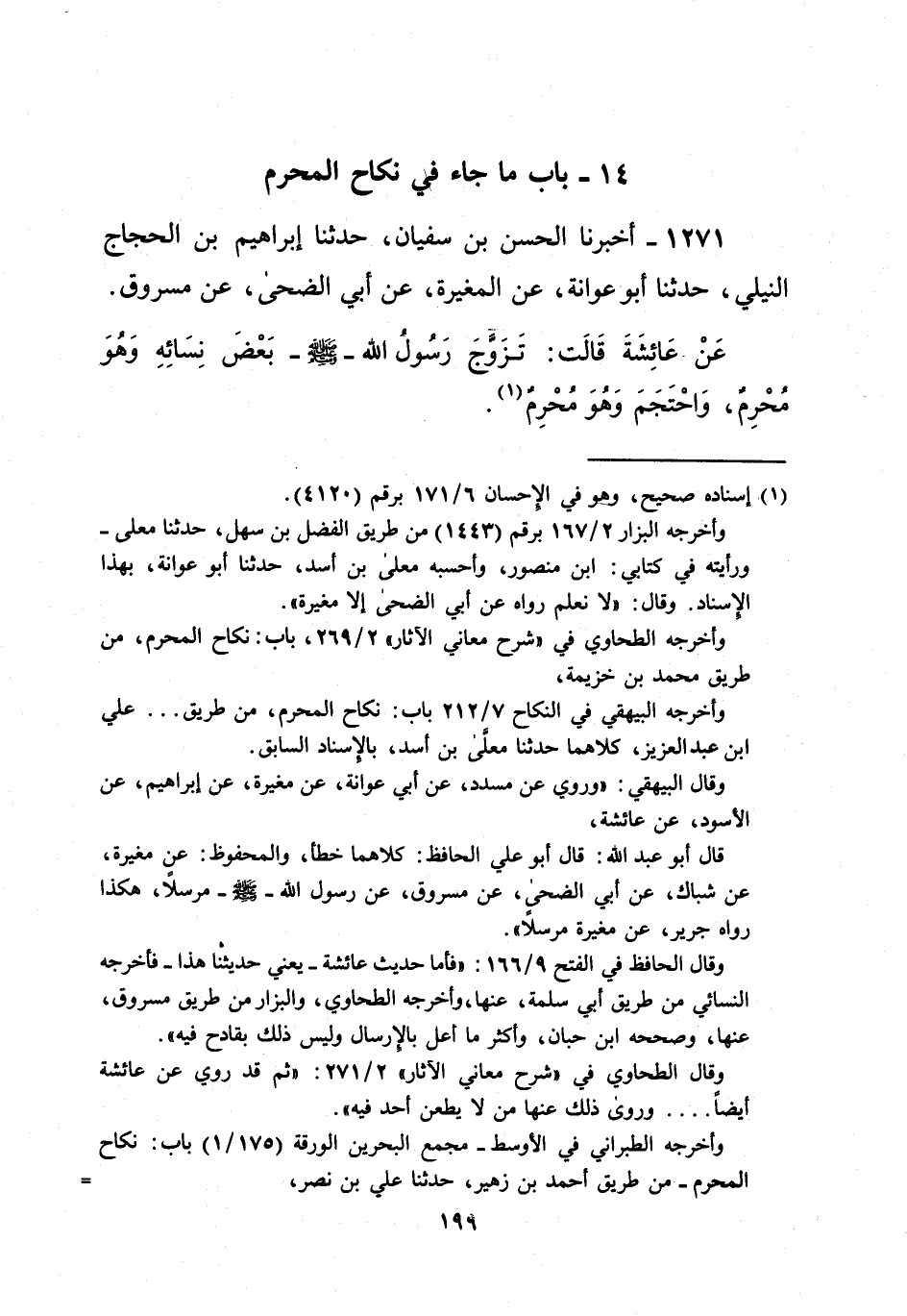 1271 - أخبرنا الحسن بن سفيان، حدثنا إبراهيم بن الحجاج النيلي، حدثنا أبو عوانة، عن المغيرة، عن أبي الضحى، عن مسروق.