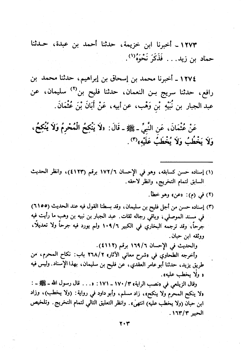 1273 - أخبرنا ابن خزيمة، حدثنا أحمد بن عبدة، حدثنا حماد بن زيد ... فَذَكَرَ نَحْوَهُ (¬1).