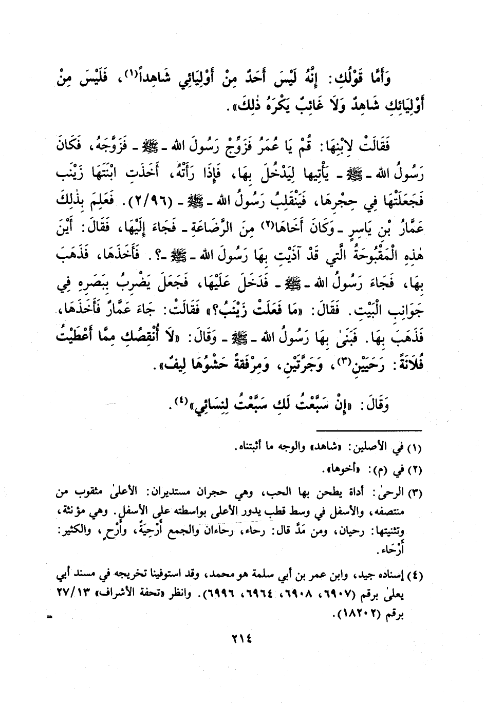 وأما قَوْلُكِ: إِنهُ لَيْسَ أَحَد مِنْ أوْلِيَائِي شَاهِداً (¬1)،فليس من أَوْلِيَائِكِ شَاهِدٌ وَلا غَائِبٌ يَكْرَهُ ذلِكَ". فَقَالَتْ لابْنِهَا: قُمْ يَا عُمَرُ فَزَوِّجْ رَسُولَ الله - صلى الله عليه وسلم - فَزَوَّجَهُ، فَكَانَ رَسُولُ الله - صلى الله عليه وسلم - يَأْتِيها لِيَدْخُلَ بِهَا، فَإِذَا رَأَتْهُ، أَخَذَتِ ابْنَتَهَا زَيْنَب فَجَعَلَتْهَا فِي حِجْرِهَا، فَيَنْقَلِبُ رَسُولُ الله - صلى الله عليه وسلم - (96/ 2). فَعَلِمَ بذلِكَ عَمَّارُ بْنِ يَاسِرٍ - وَكَانَ أَخَاهَا (¬2) مِنَ الرَّضَاعَةِ- فَجَاءَ إِلَيْهَا، فَقَالَ َ أَيْنَ هذِهِ الْمَقْبُوحَةُ التي قَدْ آذَيْتِ بِهَا رسول الله - صلى الله عليه وسلم -؟. فَأَخَذَهَا، فَذَهَبَ بِهَا، فَجَاءَ رَسُولُ الله- صلى الله عليه وسلم - فَدَخَلَ عَلَيْهَا، فَجَعَلَ يَضْرِبُ ببَصَرِهِ فِي جَوَانِبِ الْبَيْتِ. فَقَالَ: "مَا فَعَلَتْ زَيْنَبُ؟ " فَقَالَتْ: جَاءَ عَمَّارٌ فَأخَذَهَا، فَذَهَبَ بِهَا. فَبَنَى بِهَا رَسُولُ الله - صلى الله عليه وسلم - وَقَالَ: "لا أُنْقِصُكِ مِمَّا أعْطَيْتُ فلانَةً: رَحَيَيْنِ (¬3)، وَجَرَّتَيْنِ، وَمِرْفَقةً حَشْوُهَا لِيفٌ". وَقَالَ: "إنْ سبَّعْتُ لَكِ سَبَّعْتُ لِنِسَائِي" (¬4).