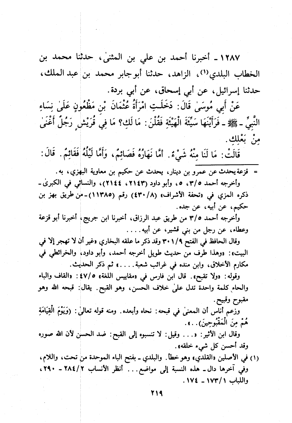 عَنْ أَبِي مُوسَى قَالَ: دَخَلَتِ امْرَأَةُ عُثْمَانَ بْنِ مَظْعُونٍ عَلَى نِسَاءِ النَّبِيِّ - صلى الله عليه وسلم - فَرَأَيْنَهَا سَيِّئَةَ الْهَيْئَةِ فَقُلْنَ: مَا لَكِ؟ مَا فِي قُرَيْشٍ رَجُلٌ أَغْنَى مِنْ بَعْلِكِ. قَالَتْ: مَا لَنَا مِنْهُ شَيْءٌ. أمَّا نَهَارُهُ فَصَائِمٌ، وَأَمَّا لَيْلُهُ فَقَائِمٌ. قَالَ: