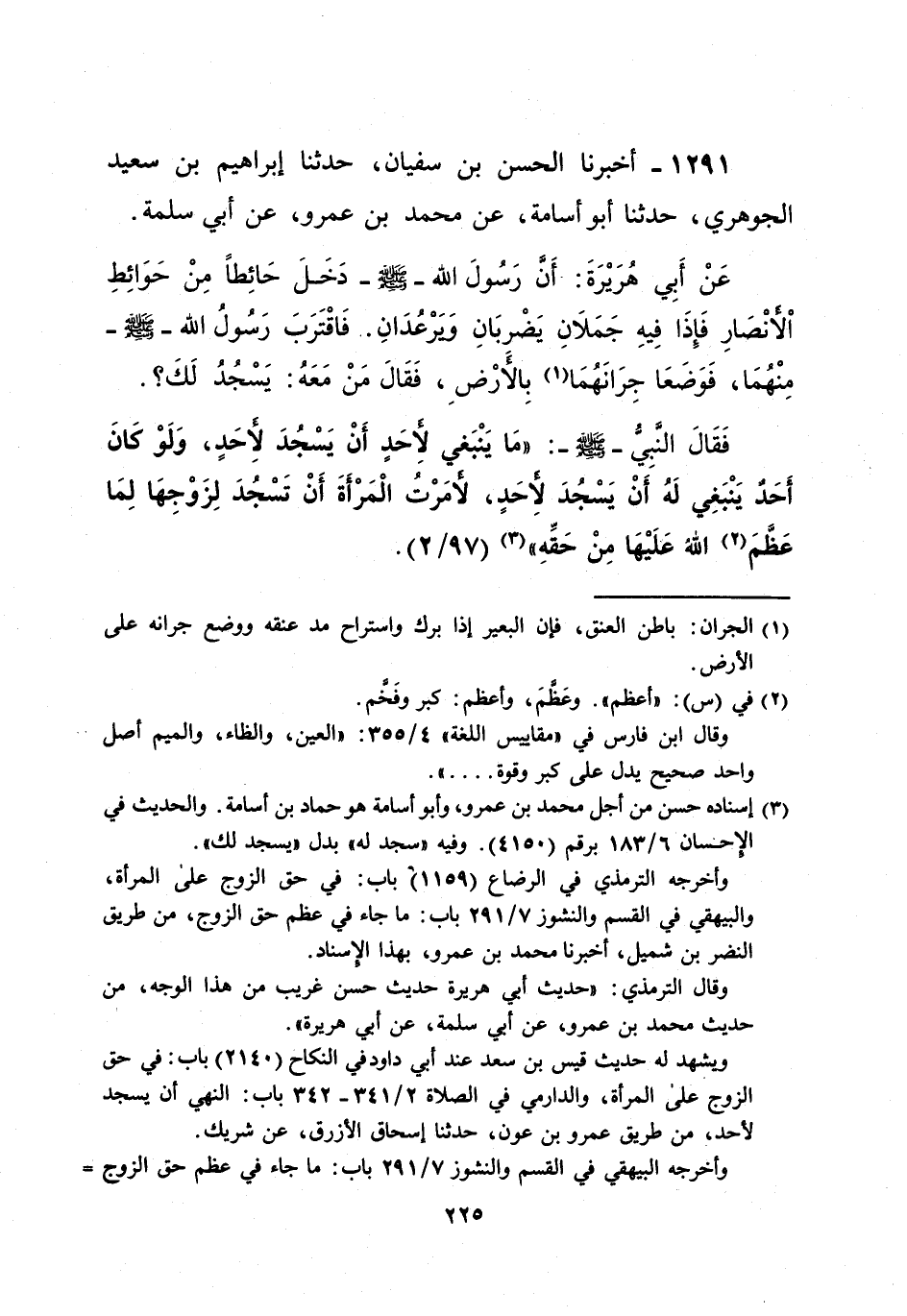 عَنْ أَبِي هُرَيْرَةَ:- أَنَّ رَسُولَ الله - صلى الله عليه وسلم - دَخَلَ حَائِطاً مِنْ حَوَائِطِ اْلأنْصَارِ فَإِذَا فِيهِ جَمَلانِ يَضْربَانِ وَيرْعُدَانِ.، فَاقْتَرَبَ رَسُولُ الله - صلى الله عليه وسلم - مِنْهُمَا، فَوَضَعَا جِرَانَهُمَا (¬1) بِالأَرْضِ، فَقَالَ مَنْ مَعَهُ: يَسْجُدُ لَكَ؟. فَقَالَ النَّبِيُّ - صلى الله عليه وسلم -: "مَا يَنْبَغي لِأحَدٍ أَنْ يَسْجُدَ لأِحَدٍ، وَلَوْ كَانَ أَحَدٌ يَنْبَغِي لَهُ أَنْ يَسْجُدَ لأحَدٍ، لأمَرْتُ الْمَرْأَةَ أَنْ تَسْجُدَ لِزَوْجِهَا لِمَا عَظَّمَ (¬2) اللهُ عَلَيْهَا مِنْ حَقِّهِ" (¬3) (97/ 2).