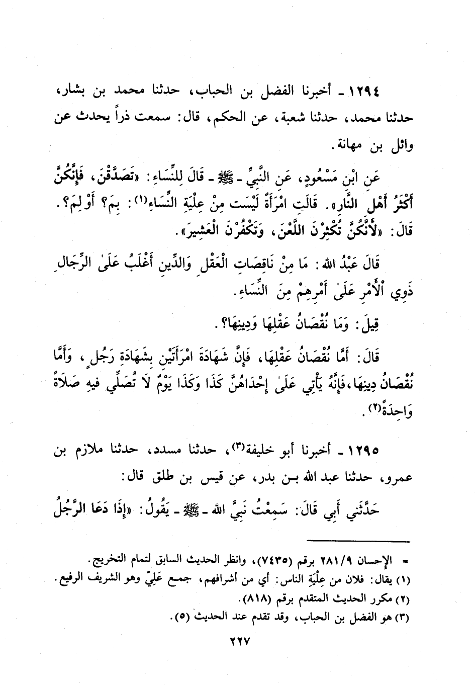 عَنِ ابْن مَسْعُودٍ، عَنِ النَّبِي - صلى الله عليه وسلم - قَالَ لِلنِّسَاءِ:" تَصَدقْنَ، فَإنكُنَّ أَكْثَرُ أَهْل النَّارِ". قَالَتِ امْرَأَةٌ لَيْسَت مِنْ عِلْيَةِ النِّسَاءِ (¬1): بِمَ؟ أَوْ لِمَ؟. قَالَ: "َّ تُكْثِرْنَ اللَّعْنَ، وَتَكْفُرْنَ الْعَشِيرَ". قَالَ عَبْدُ الله: مَا مِنْ نَاقِصَاتِ الْعَقْلِ وَالدِّينِ أَغْلَبُ عَلَى الرِّجَالِ ذَوِي اْلأمْرِ عَلَى أَمْرِهِمْ مِنَ النِّسَاءِ. قِيلَ: وَمَا نُقْصانُ عَقْلِهَا وَدِينِهَا؟. قَالَ: أما نُقْصانُ عَقْلِهَا، فَإِنَّ شَهَادَةَ امْرَأَتَيْنِ بِشَهَادَةِ رَجُلٍ، وأما نُقْصَانُ دِينِهَا، فَإِنَّهُ يَأْتِي عَلَى إِحْدَاهُنَّ كَذَا وَكَذَا يَوْمٌ لا تُصَلِّي فيهِ صَلاةً وَاحِدَةً (¬2).