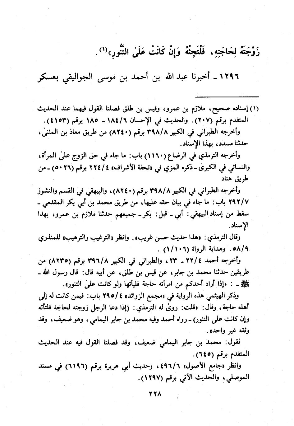 وأخرجه أحمد 4/ 22 - 23، والطبراني في الكبير 8/ 396 برقم (8235) من طريقين حدثنا محمد بن جابر، عن قيس بن طلق، عن أبيه قال: قال رسول الله- صلى الله عليه وسلم -: "إذا أراد أحدكم من امرأته حاجة فليأتها ولو كانت على التنور".