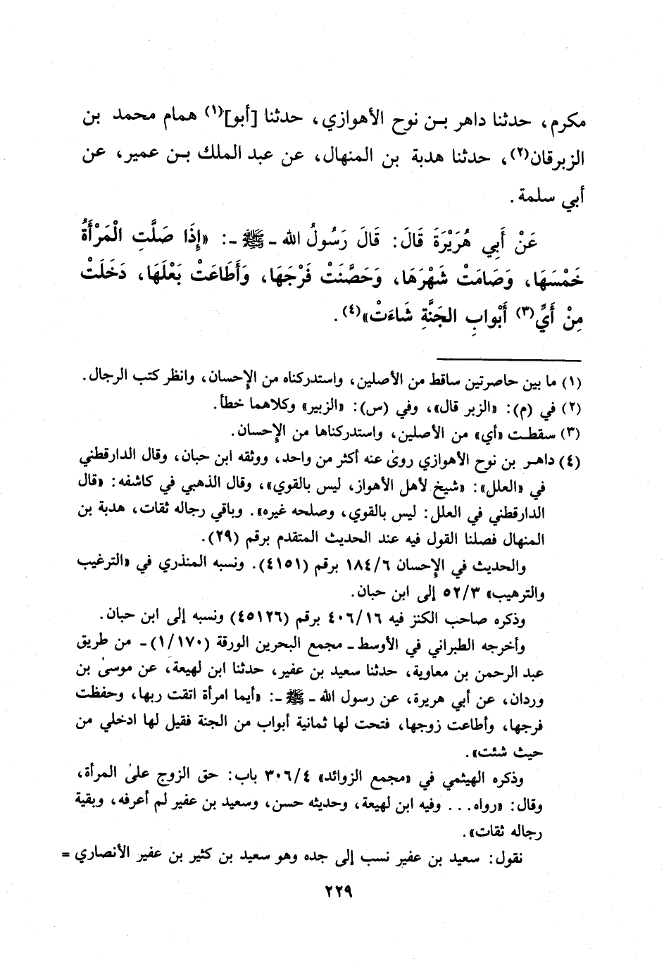 (¬4) داهر بن نوح الأهوازي روى عنه أكثر من واحد، ووثقه ابن حبان، وقال الدارقطني في "العلل" بن: "شيخ لأهل الأهواز، ليس بالقوي"، وقال الذهبي في كاشفه: "قال الدارقطني في العلل: ليس بالقوي، وصلحه غيره". وباقي رجاله ثقات، هدبة بن المنهال فصلنا القول فيه عند الحديث المتقدم برقم (29).