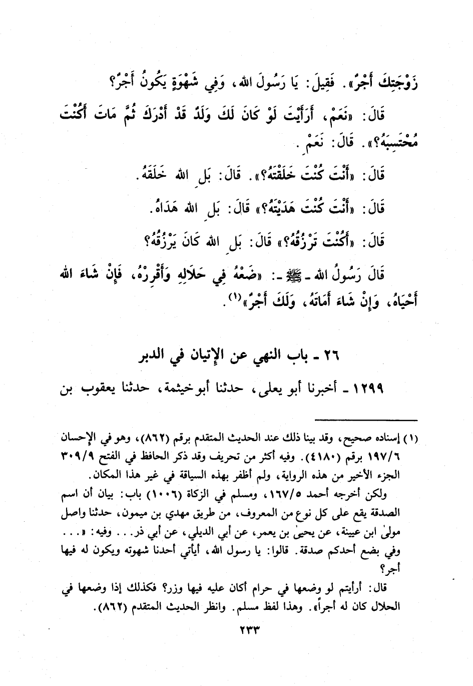 زَوْجَتِكَ أَجْرٌ". فَقِيلَ: يَا رَسُولَ الله، وَفِي شَهْوَةٍ يَكُونُ أَجْرٌ؟ قَالَ: "نَعَمْ، أَرَأَيْتَ لَوْ كان لَكَ وَلَد قَدْ أَدْرَكَ ثُمَّ مَاتَ أَكُنْتَ مُحْتَسِبَهُ؟ ". قَالَ: نَعَمْ. قَالَ: "أَنْتَ كُنْتَ خَلَقْتَهُ؟ ". قَالَ: بَلِ الله خَلَقَهُ. قَالَ: "أنْتَ كُنْتَ هَدَيْتَهُ؟ " قَالَ: بَلِ الله هَدَاهُ. قَالَ: "أكنْتَ تَرْزُقُهُ؟ " قَالَ: بَلَ الله كَانَ يَرْزُقُهُ؟ قَالَ رَسُولُ الله - صلى الله عليه وسلم -:"ضَعْهُ فِي حَلالِهِ وَأَقْرِرْهُ، فَإِنْ شَاءَ الله أَحْيَاهُ، وَإِنْ شَاءَ أمَاتَهُ، وَلَكَ أجر" (¬1).