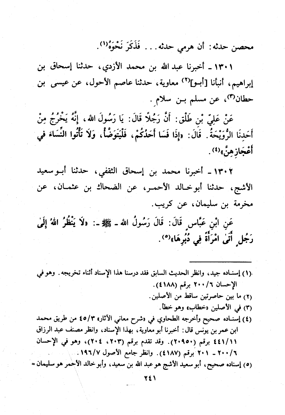 عَنْ عَلِيّ بْنِ طَلْق: أَنَ رَجُلاً قَالَ: يَا رَسُولَ الله، إنَّهُ يَخْرُجُ مِنْ أَحَدِنَا الرُّويحَةُ. قَالَ: "إذَا فَسَا أَحَدُكُمْ، فَلْيَتَوَضأ، وَلا تَأْتُوا النِّسَاءَ في أعْجَازِهِنَّ" (¬4).