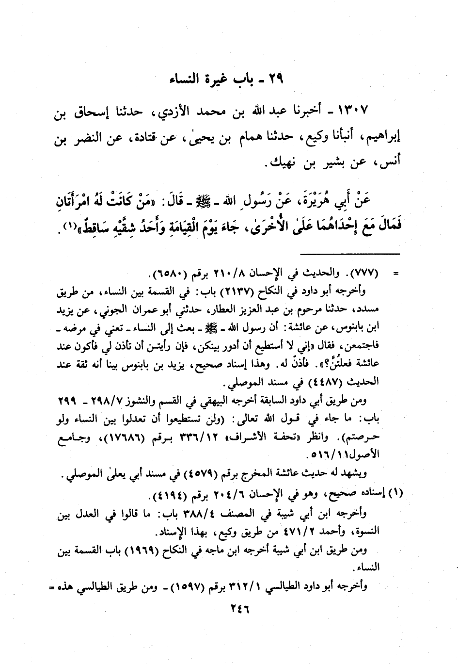 عَنْ أَبِي هرَيْرَةَ، عَنْ رَسُولِ الله - صلى الله عليه وسلم - قَالَ: "مَنْ كَانَتْ لَهُ امْرَأتَانِ فَمَالَ مَعَ إِحْدَاهُمَا عَلَى الأخْرَى، جَاءَ يَوْمَ الْقِيَامَةِ وَأحَدُ شِقَّيْهِ سَاقِط" (¬1).