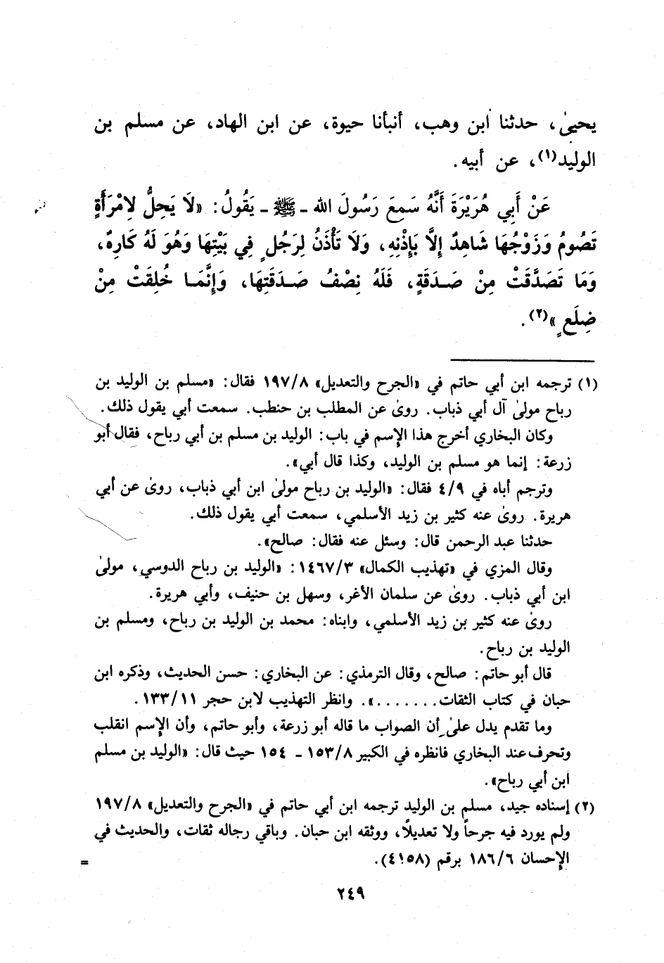 عَنْ أَبِي هُرَيْرَةَ أَنَّهُ سَمعَ رَسُولَ الله - صلى الله عليه وسلم - يَقُولُ: "لا يَحِلُّ لامْرَأَةٍ تَصُومُ وَزَوْجُهَا شاهِدٌ إِلاَّ بَإذْنِهِ، وَلا تَأْذَنُ لِرَجُلٍ فِي بَيْتِهَا وَهُوَ لَهُ كَارِهٌ، وَمَا تَصَدَّقَتْ مِنْ صَدَقَةٍ، فَلَهُ نِصْفُ صَدَقَتِهَا، وَإِنَّمَا خُلِقَتْ مِنْ ضِلَعٍ" (¬2).