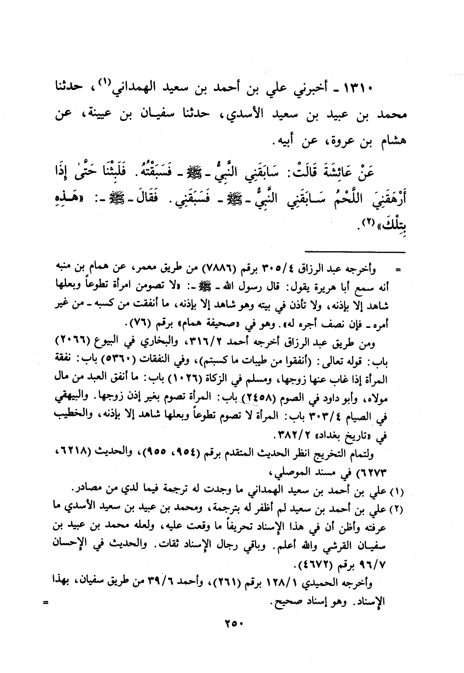 1310 - أخبرني علي بن أحمد بن سعيد الهمداني (¬1)، حدثنا محمد بن عبيد بن سعيد الأسدي، حدثنا سفيان بن عيينة، عن هشام بن عروة، عن أبيه.