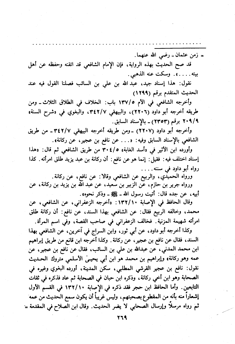 وكذا أخرجه أبو داود، عن أبي ثور، وابن السراج في آخرين، عن الشافعي بهذا السند، فقال عن نافع بن عجير، عن ركانة. وكذا أخرجه ابن قانع من طريق إبراهيم ابن محمد المدني، عن عبد الله بن علي بن السائب، فقال عن نافع بن عجير، عن عمه وهو ركانة" وإبراهيم بن محمد هو ابن أبي يحيى الأسلمي متروك الحديث نقول: نافع بن عجير القرشي المطلبي، سكن المدينة، أورده البغوي وغيره في الصحابة وهو ابن أخي ركانة، وذكره ابن حبان في الصحابة ثم عاد فذكره في ثقات التابعين. وأما الحافظ ابن حجر فقد ذكره في الإصابة 10/ 132 في القسم الأول إشعاراً منه بأنه من المقطوع بصحبتهم، وليس غريباً أن يكون سمع الحديث من عمه ثم رواه مرسلا وإرسال الصحابي لا يضر الحديث. وقال ابن الصلاح في المقدمة =