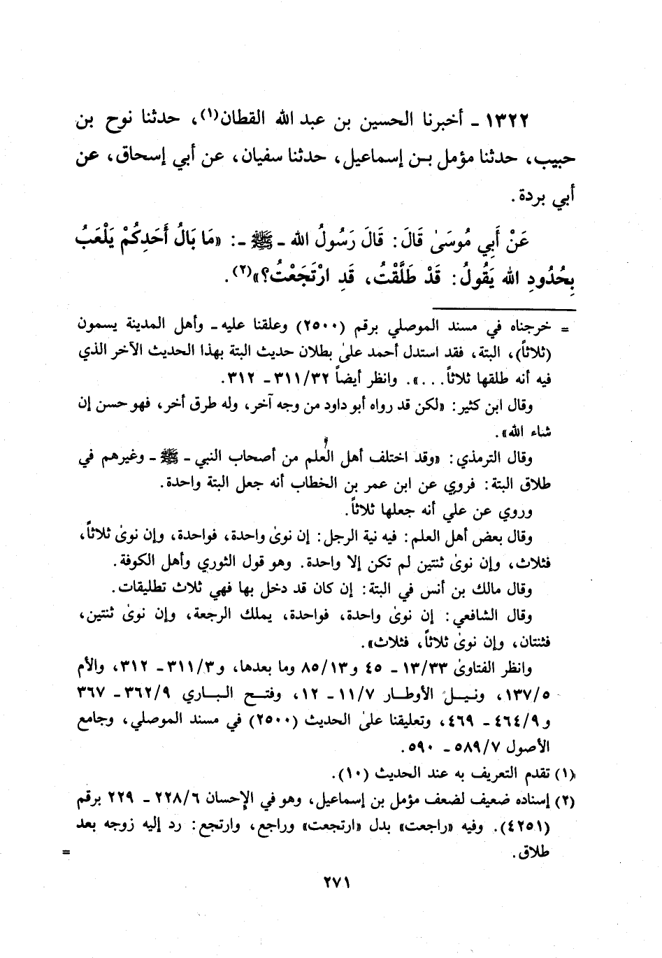 عَنْ أَبِي مُوسَى قَالَ: قَالَ رَسُولُ الله - صلى الله عليه وسلم -:" مَا بَالُ أَحَدِكُمْ يَلْعَبُ بِحُدُودِ الله يَقُولُ: قَدْ طَلَّقْتُ، قَدِ ارْتَجَعْتُ؟ " (¬2).