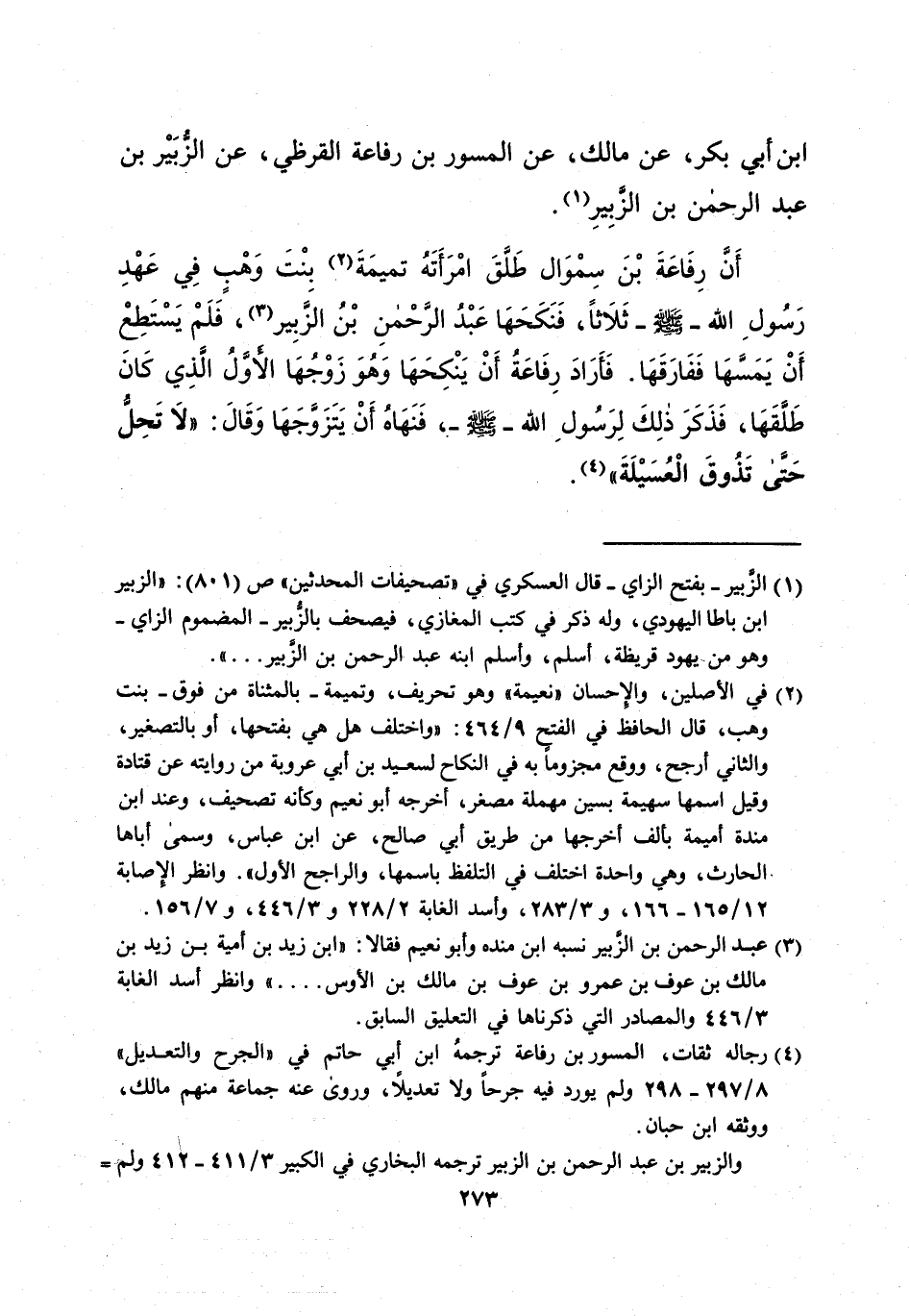 أَنَّ رِفَاعَةَ بْنَ سِمْوَال طَلَّقَ امْرَأَتَهُ تميمَةَ (¬2) بنْتَ وَهْبٍ فِي عَهْدِ رَسُولِ الله - صلى الله عليه وسلم - ثَلاثاً، فَنَكَحَهَا عَبْدُ الرحْمنِ بْنُ الَزَّبِير (¬3)،َ فَلَمْ يَسْتَطِع أَنْ يَمَسَّهَا فَفَارَقَهَا. فَأَرَادَ رِفَاعَةُ أَنْ يَنْكِحَهَا وَهُوَ زَوْجُهَا الأوَّلُ الَّذِي كَان طَلَّقَهَا، فَذَكَرَ ذلِكَ لِرَسُولِ الله - صلى الله عليه وسلم -، فَنَهَاهُ أَنْ يَتَزَوَّجَهَا وَقَالَ:"لا تحل حَتَّى تَذُوقَ الْعُسَيْلَةَ" (¬4).