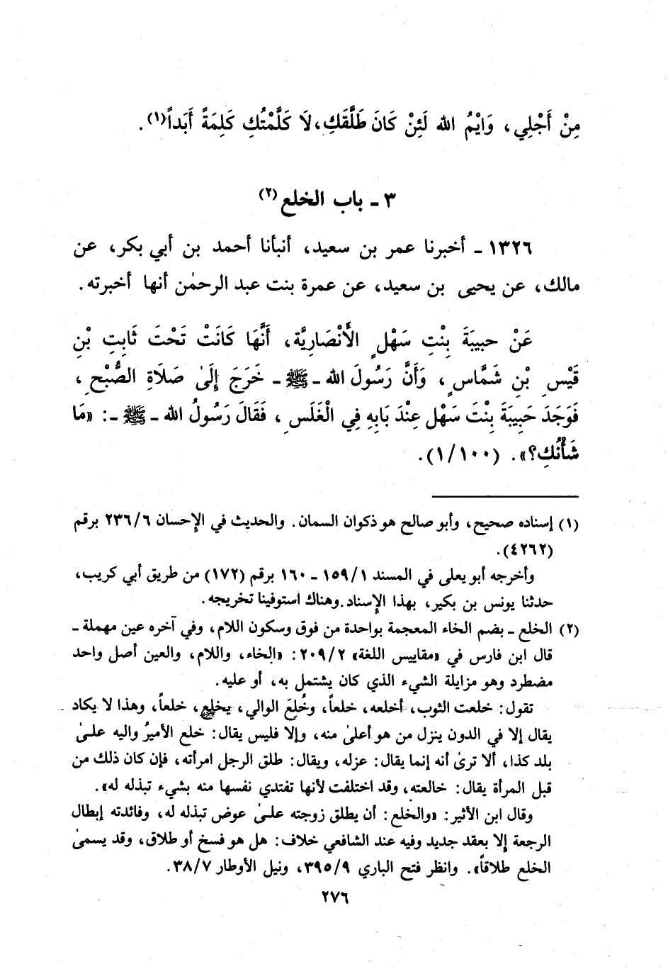 عَنْ حبيبَةَ بِنْتِ سَهْل الأنْصَارِيَّة، أَنَّهَا كَانَتْ تَحْتَ ثَابِتِ بْنِ قَيْسِ بْنِ شَمَّاس، وَأَنَّ رَسُولَ الله - صلى الله عليه وسلم - خَرَجَ إلَى صَلاةِ الصُّبْحِ، فَوَجَدَ حَبِيبَةَ بِنْتَ سَهْل عِنْدَ بَابِهِ فِي الْغَلَسِ، فَقَالَ رَسُولُ الله - صلى الله عليه وسلم -:"مَا شَأنُكِ؟ ". (100/ 1).
