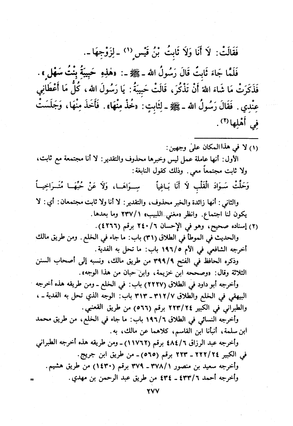 فَقَالَتْ: لا أَنَا وَلا ثَابِتُ بْنُ قَيْس (¬1) - لِزَوْجِهَا-. فَلَمَّا جَاءَ ثَابِت قَالَ رَسُولُ الله - صلى الله عليه وسلم -: "هذِهِ حَبِيبَةُ بِنْتُ سَهْل". فَذَكَرَتْ مَا شَاءَ اللهُ أَنْ تَذْكُرَ، قَالَتْ حَبِيبَةُ: يَا رسول الله، كُلُّ مَا أَعْطَانِي عِنْدِي. فَقَالَ رَسُولُ الله - صلى الله عليه وسلم - لِثَابِتٍ: "خُذْ مِنْهَا". فَاَخَذَ مِنْهَا، وَجَلَسَتْ فِي أَهْلِها (¬2).